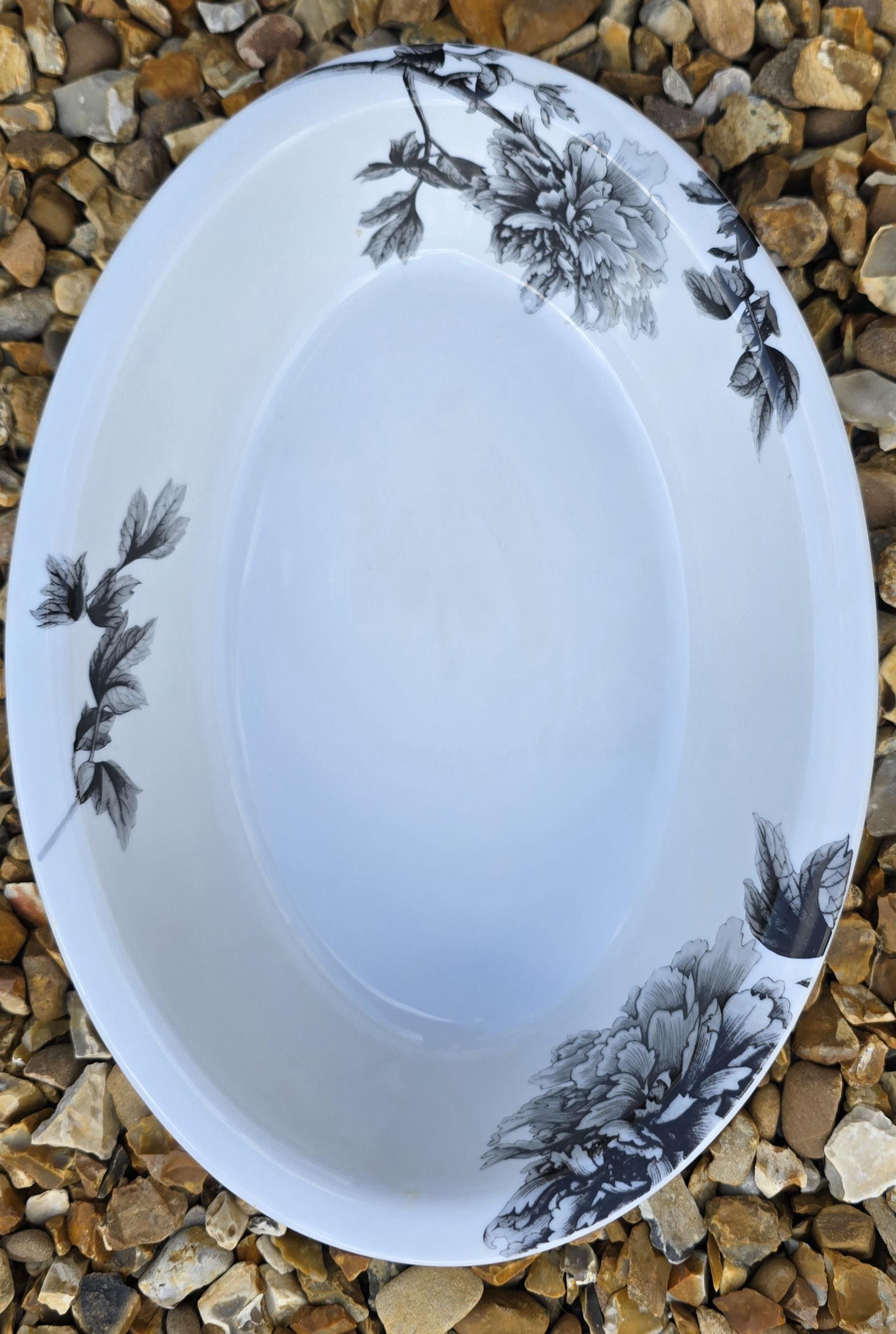 Add a touch of timeless elegance to your table with this beautiful and rare oval serving dish from Royal Worcester's Black Peony collection. This piece features a striking and sophisticated black and white floral design with delicate peony blooms and foliage. Crafted from high-quality fine bone china, this dish is perfect for serving vegetables, side dishes, or a small roast. The classic design ensures it will blend seamlessly with a modern or traditional aesthetic.