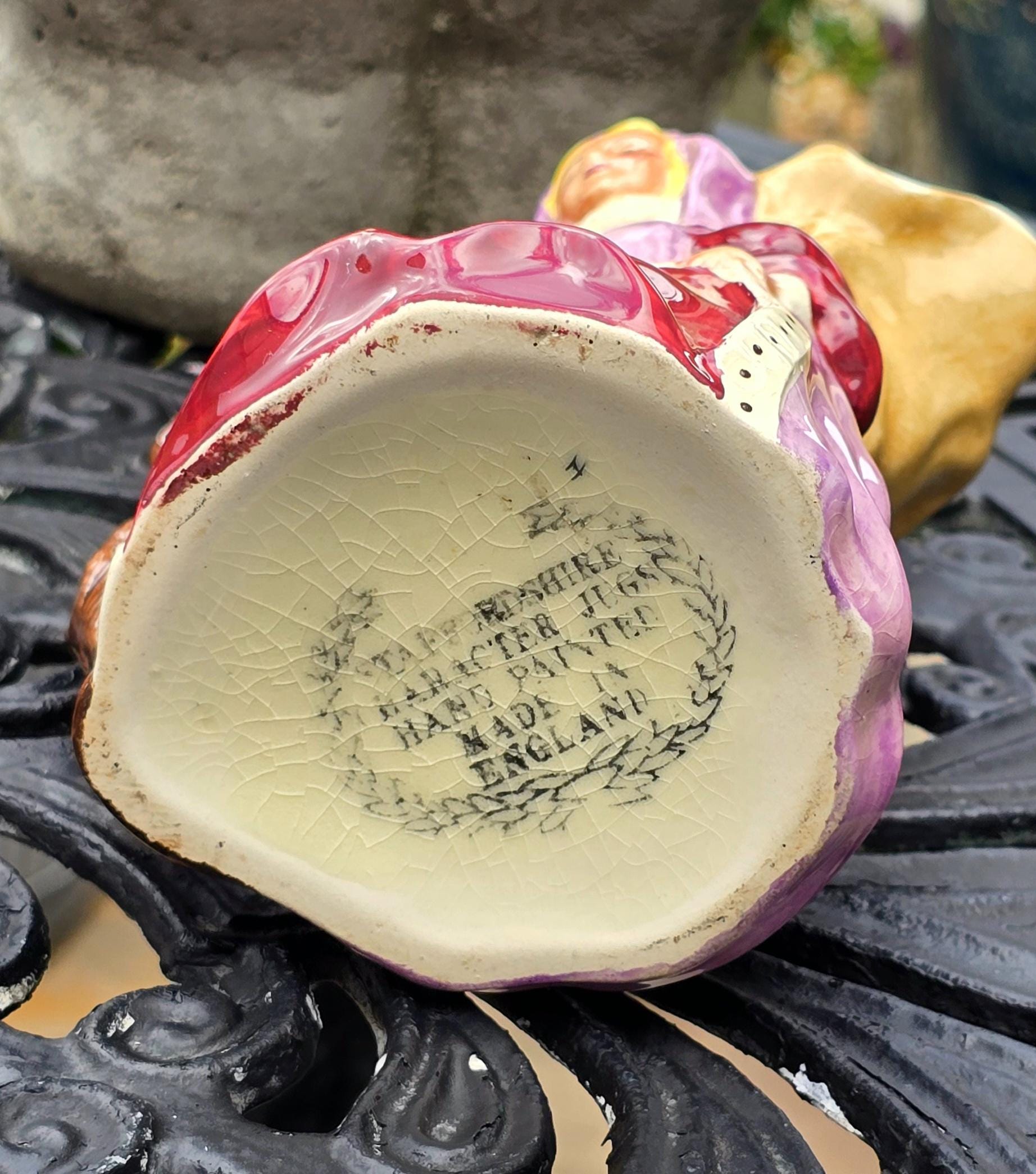 ​Made in England, the bottom of the jug is stamped with the words "Staffordshire Character Jugs, Hand Painted, Made in England," and a wreath surrounding the text. This hallmark ensures its authenticity and quality.