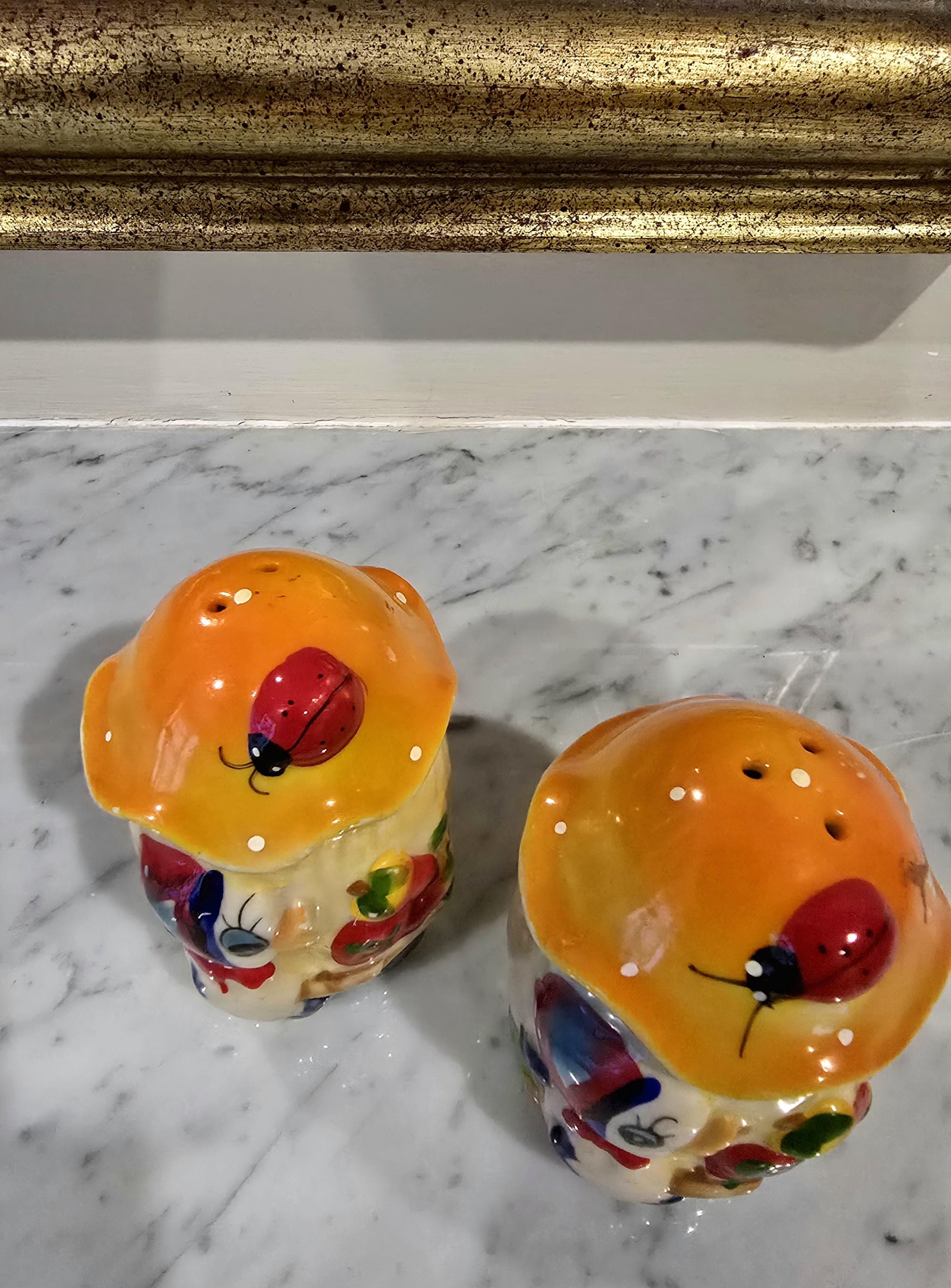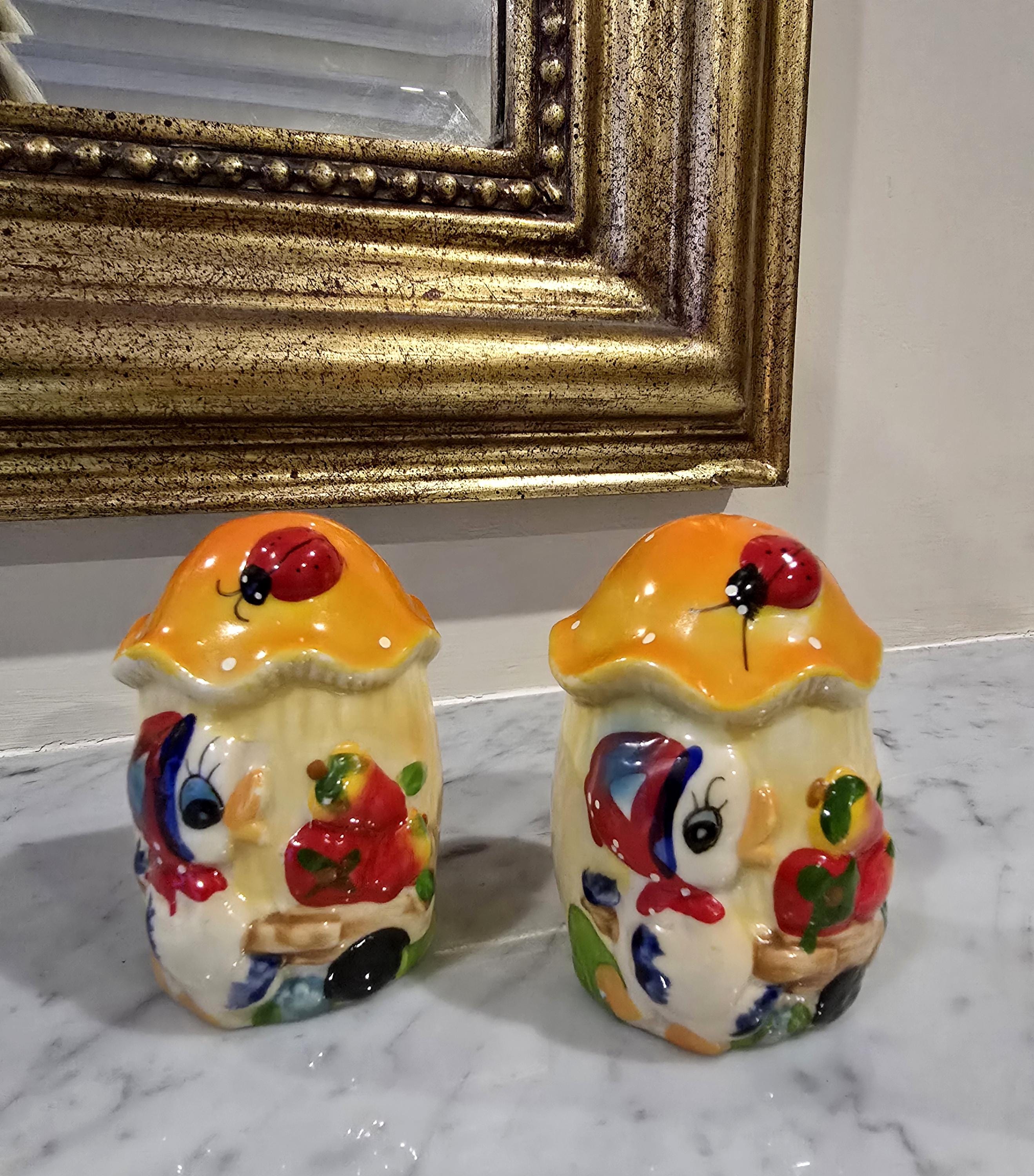 Vintage Duck Salt & Pepper Shakers: Whimsical Ceramic Ladybug Mushroom Caps