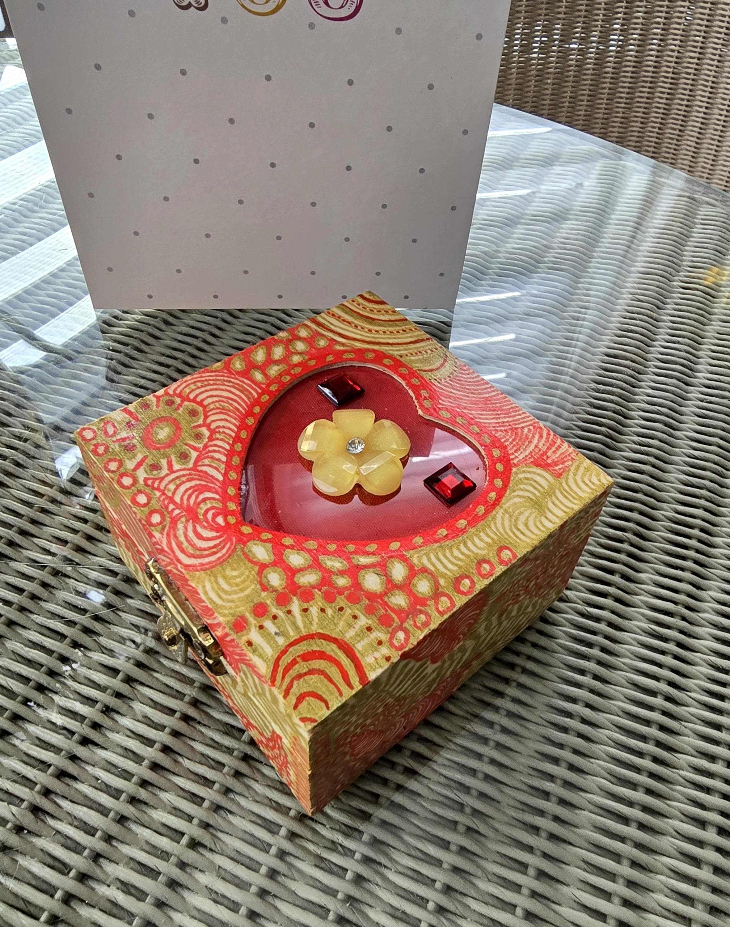 Lovely little trinket box, handmade and defined by artistry of swirls and doodles. The upper lid, lined in rich red textile, evokes reverence without the plushness of velvet.