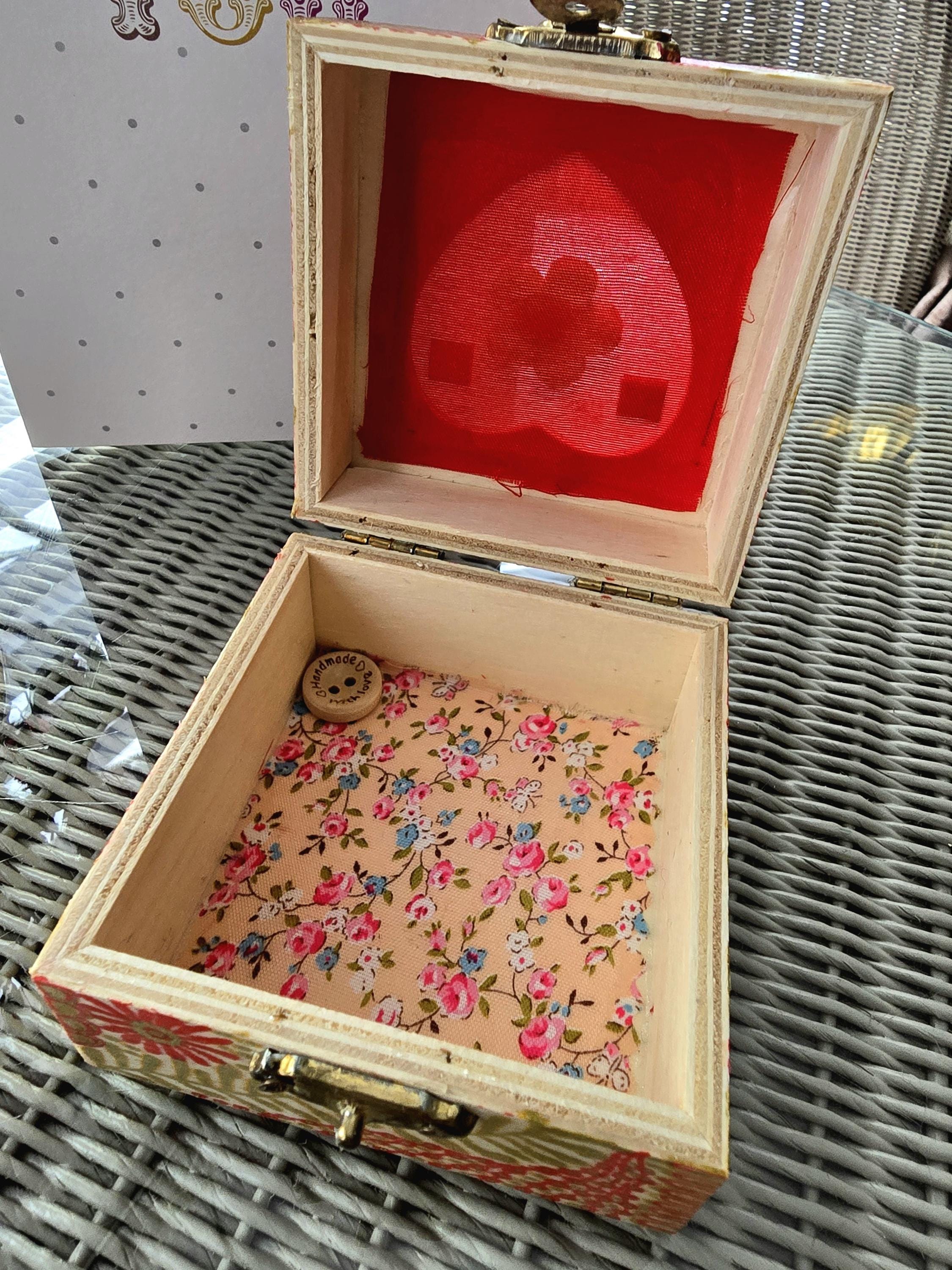 Handmade Rustic Wooden Trinket Box: Red Textile Floral Lining