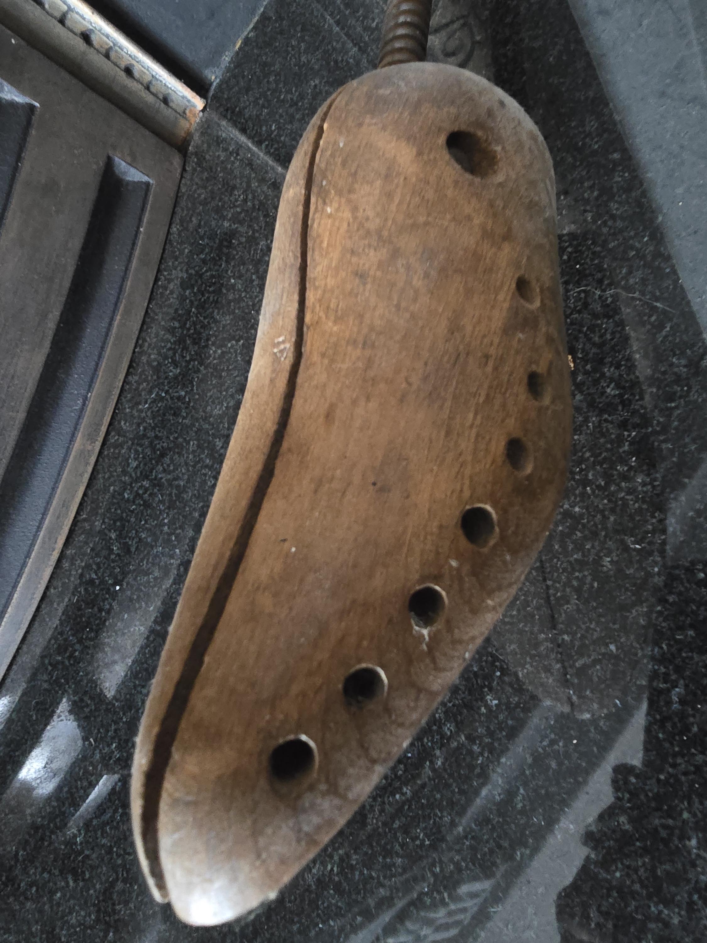 A beautifully aged wooden shoe last, once used by cobblers and shoemakers to shape, stretch, and repair footwear with precision and care. This sculptural relic carries the quiet dignity of a working tool—its drilled sole and flattened profile suggest use in crafting low-profile shoes or slippers, possibly in a small workshop or domestic setting.