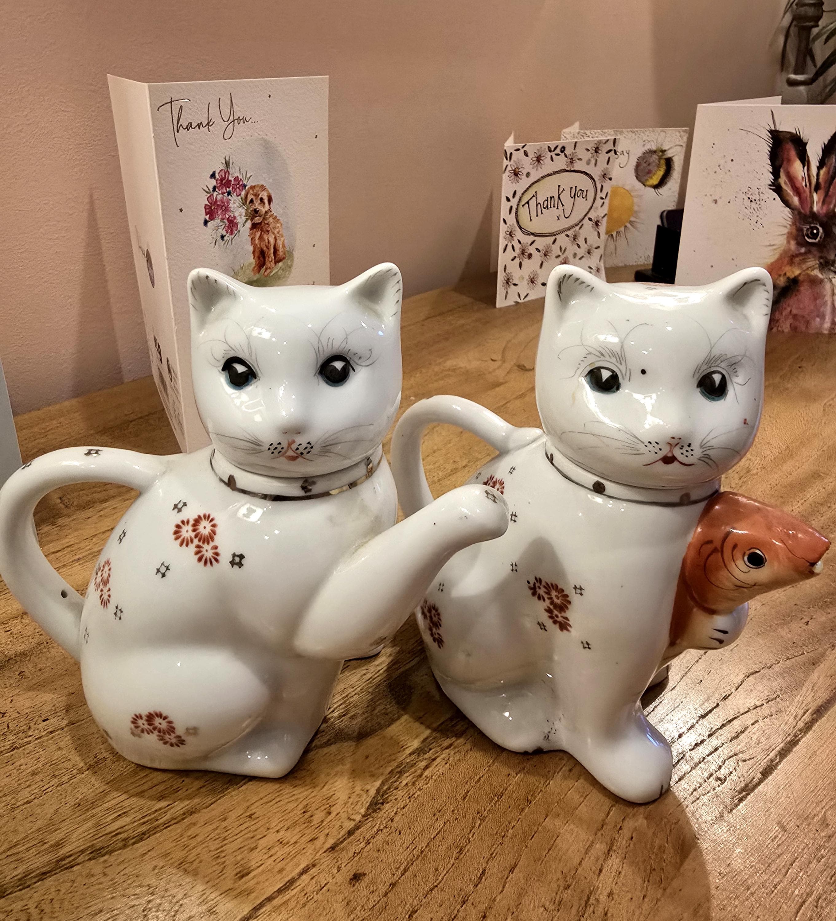 Their heads rotate gently, allowing for expressive positioning, while their bodies bloom with floral motifs. One holds a ceramic fish in its paw, adding a storytelling flourish to the set. Absolutely gorgeous in form and spirit, they’re ideal for collectors, cat lovers, or anyone curating a kitchen with character.