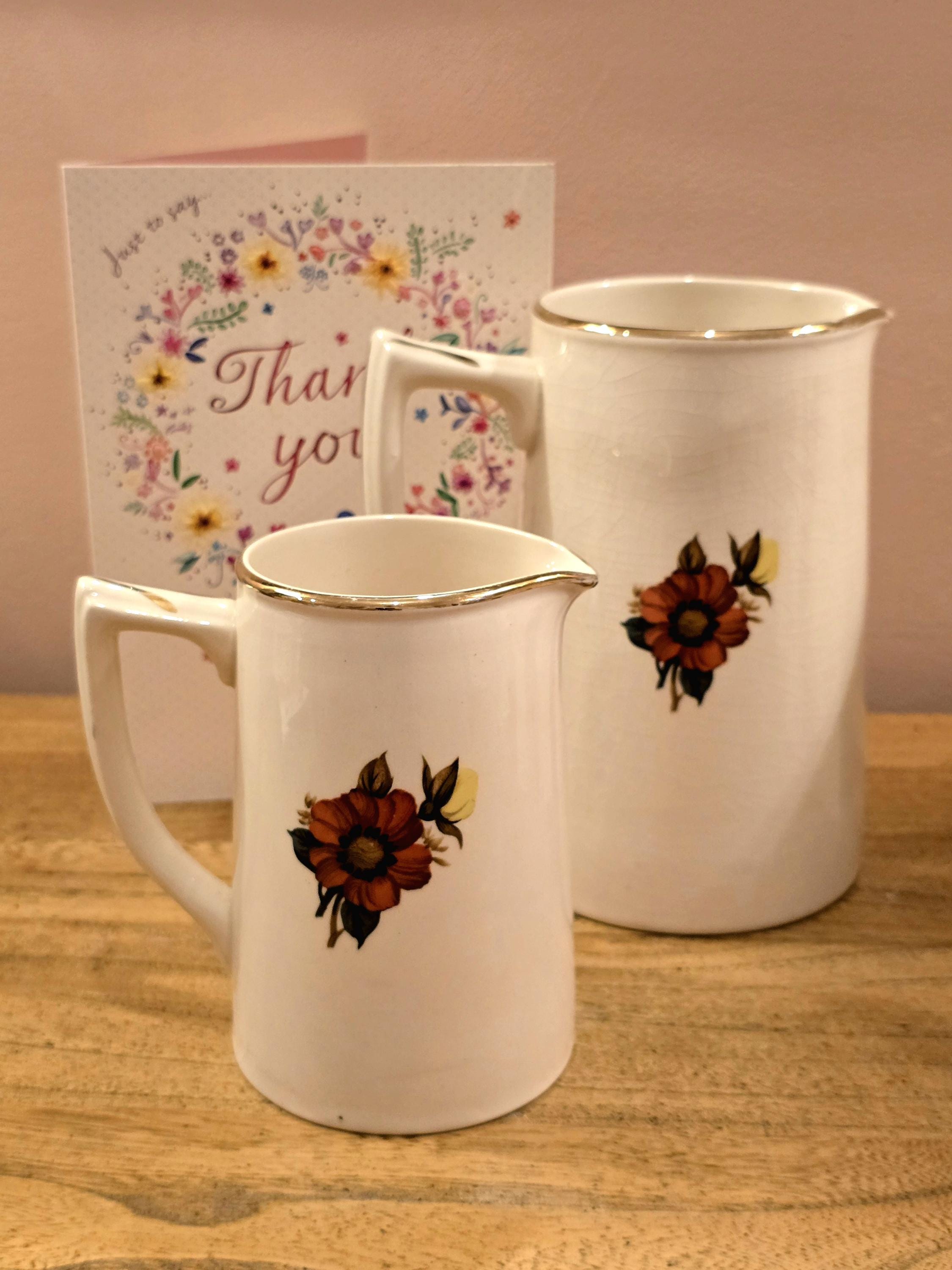 - Sizes: Approx. 16cm (taller jug) and 12cm (smaller jug)