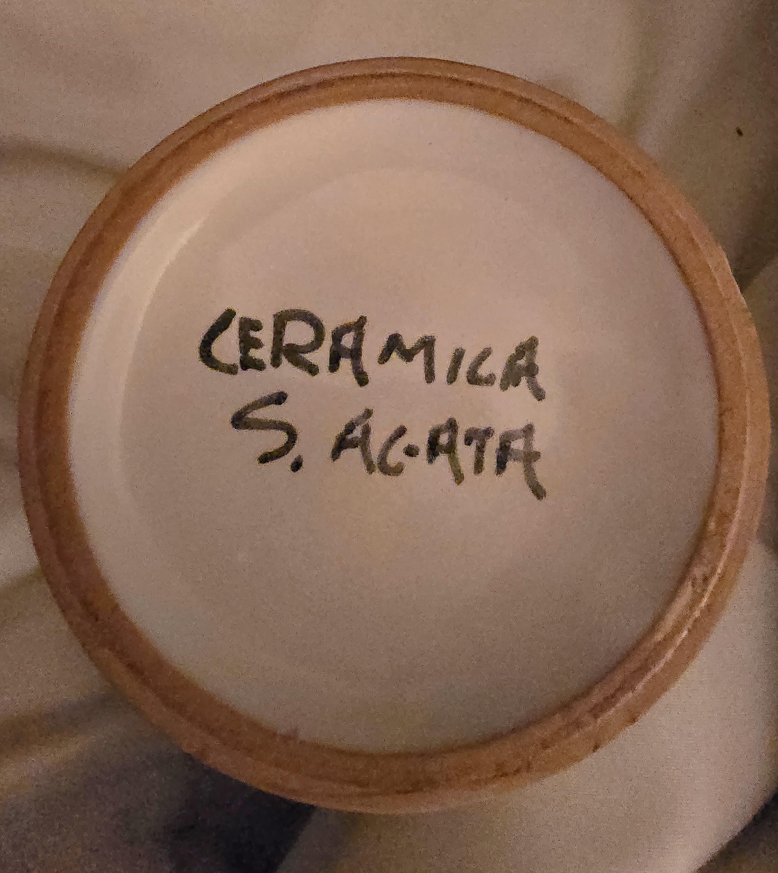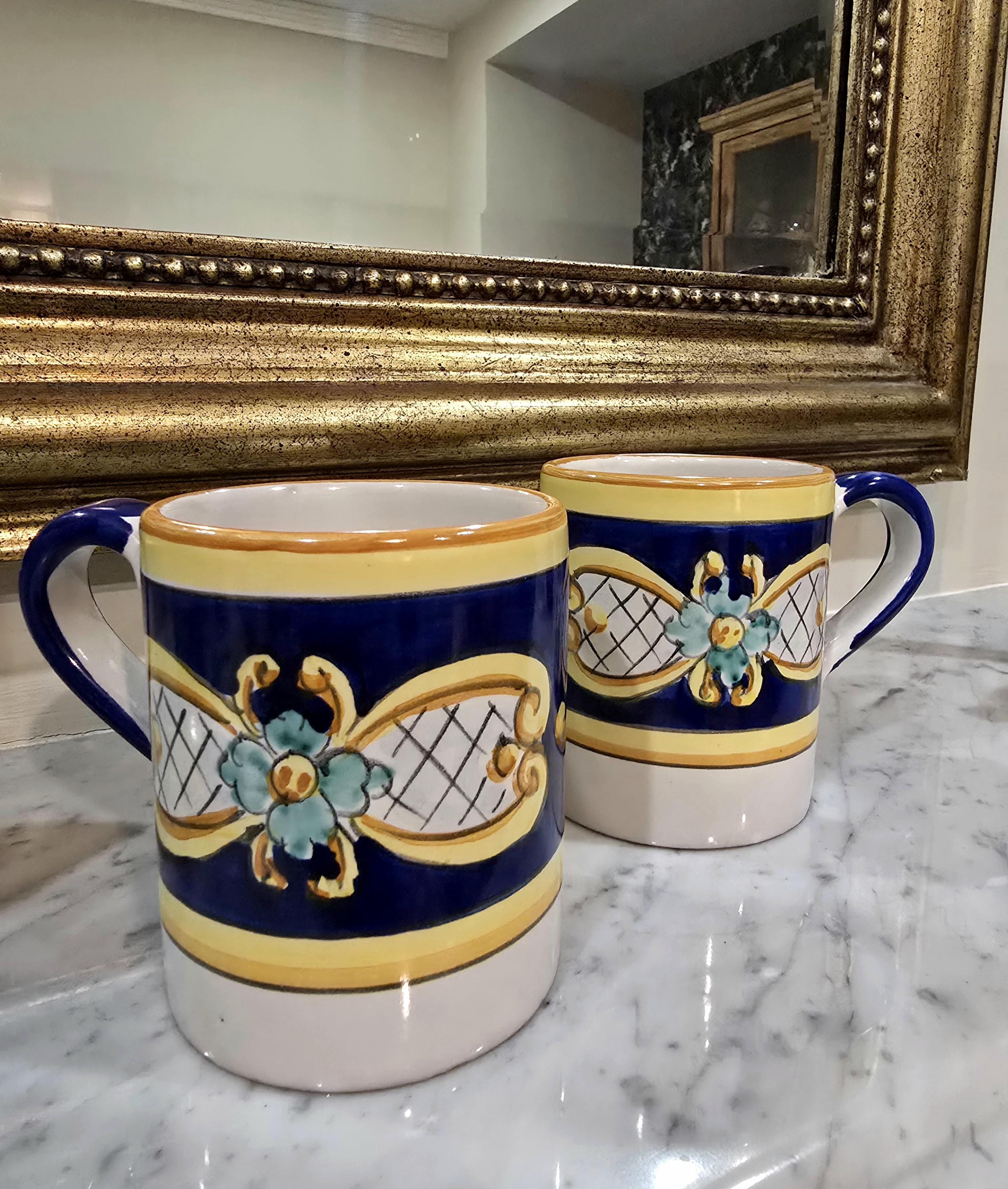 Likely crafted in or near Sant’Agata, Italy, these mugs carry the mark Ceramica S. Agata on their base—an artisan touch that speaks to provenance and tradition. The handles are deep blue, sturdy and sculptural, balancing the ornate pattern with practical grace.