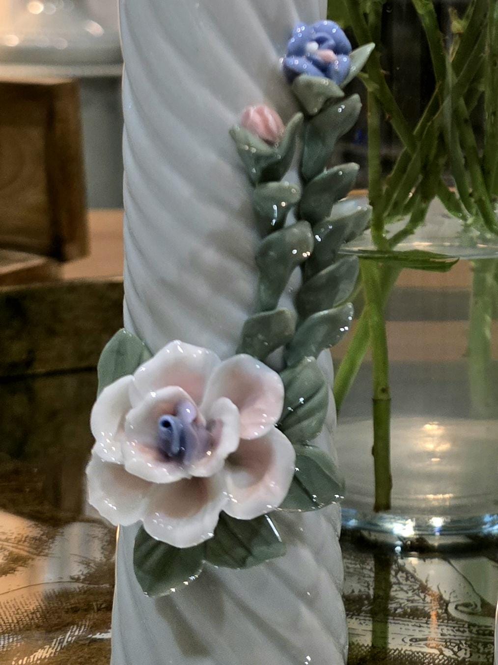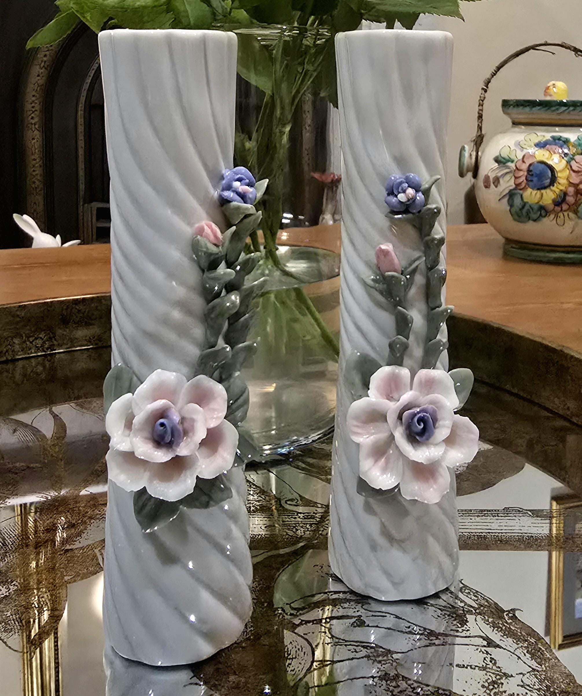 A charming pair of vintage ceramic bud vases with a glossy spiral design and 3D floral appliqué in soft pastel tones. Each vase stands 18cm tall, perfect for displaying single stems, dried flowers, or as statement decor on a shelf or vanity.
