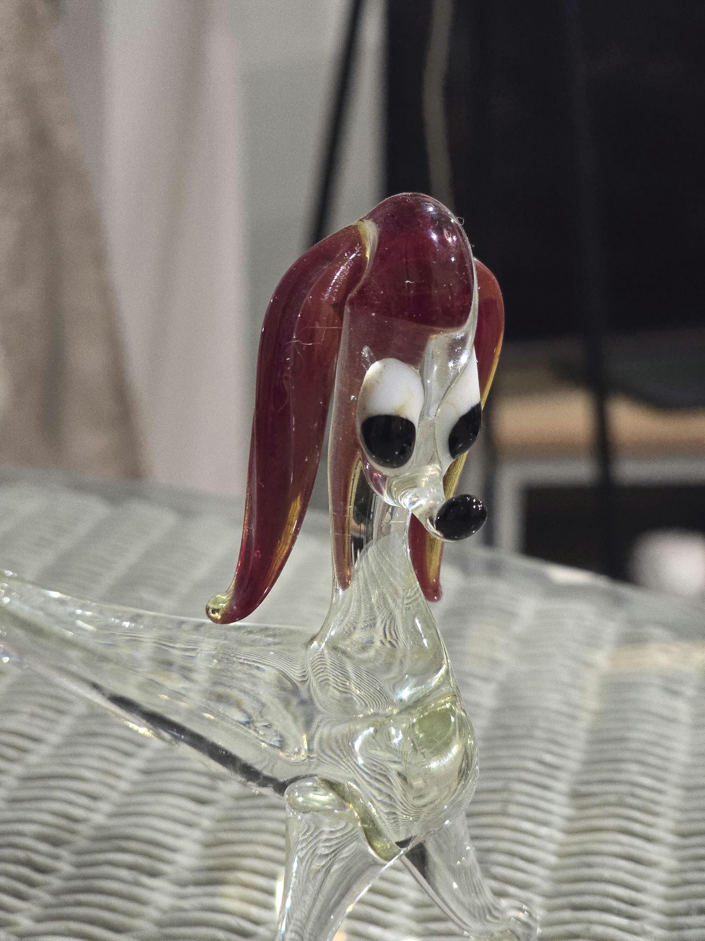 A clear glass dachshund with a mischievous glint and a tail that tells stories. Measuring 21cm from nose to tail and 10cm high from paw to proud head, this elongated creature carries the spirit of stylised loyalty and playful elegance. Red and copper accents on the ears and tail lend a touch of warmth, while the exaggerated eyes invite companionship or quiet amusement.