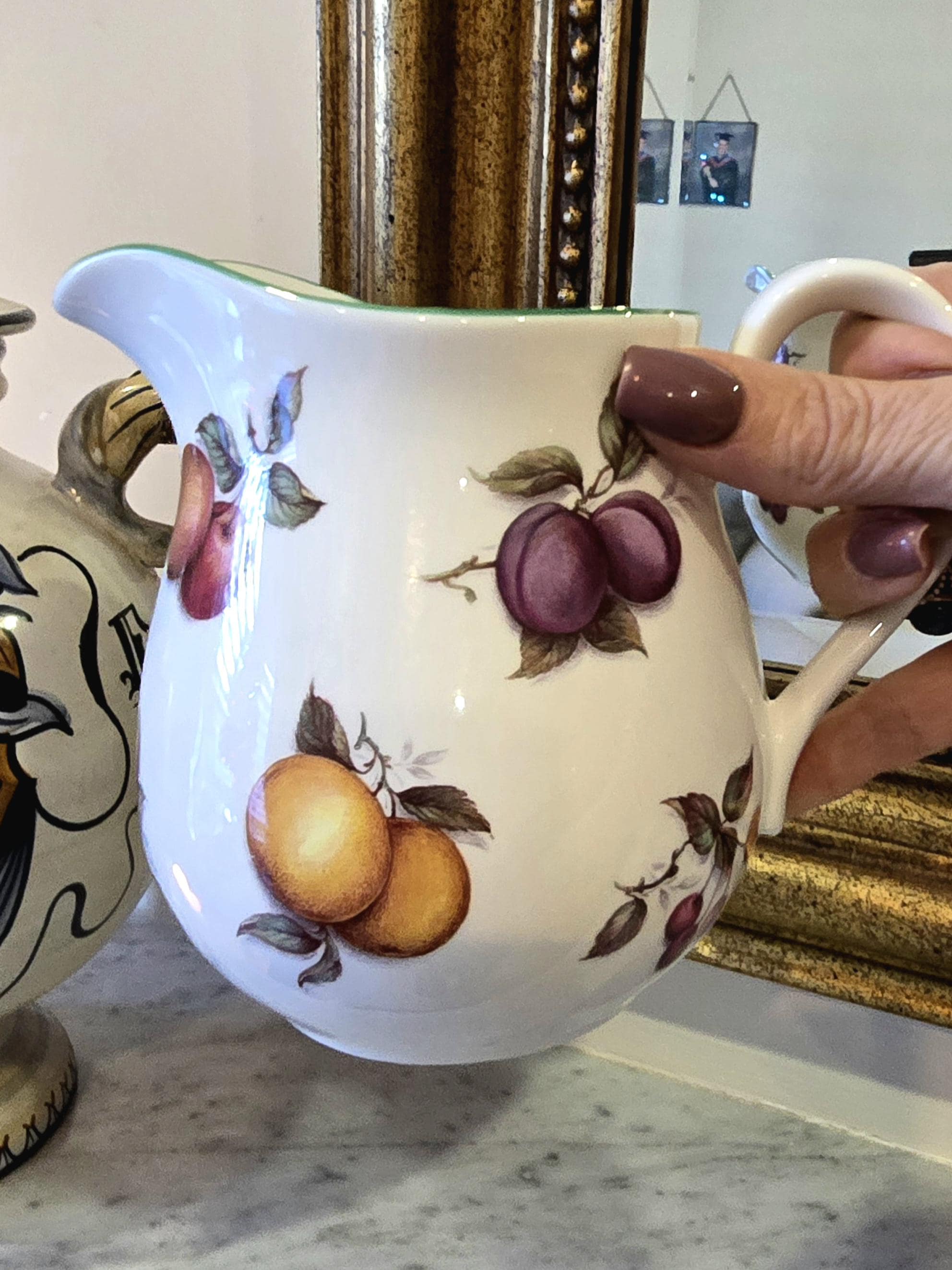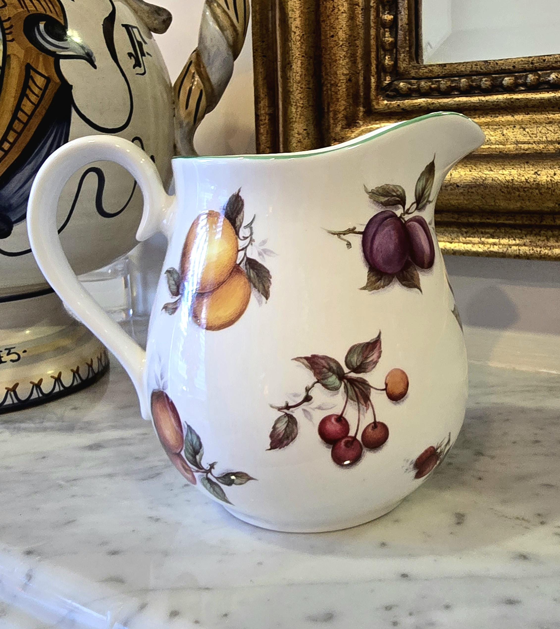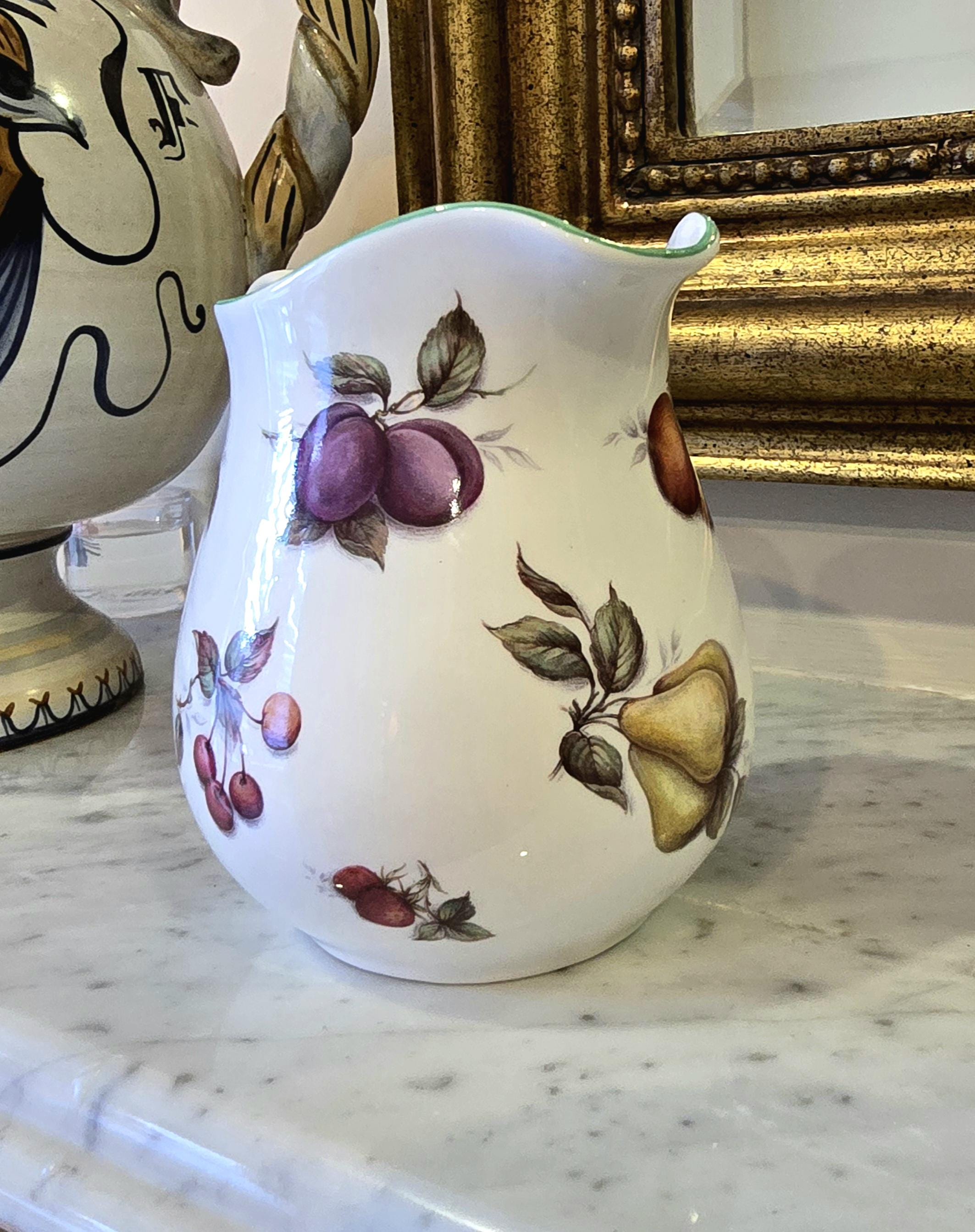 A petite ceramic jug from Milton China, Staffordshire, England. Measuring 13cm high, it is decorated with garlands of orchard fruit—plums, peaches, and leafy greens—set against a white bone china body with a soft green rim. A versatile piece, perfect for pouring cream, holding blooms, or styling a shelf vignette.
