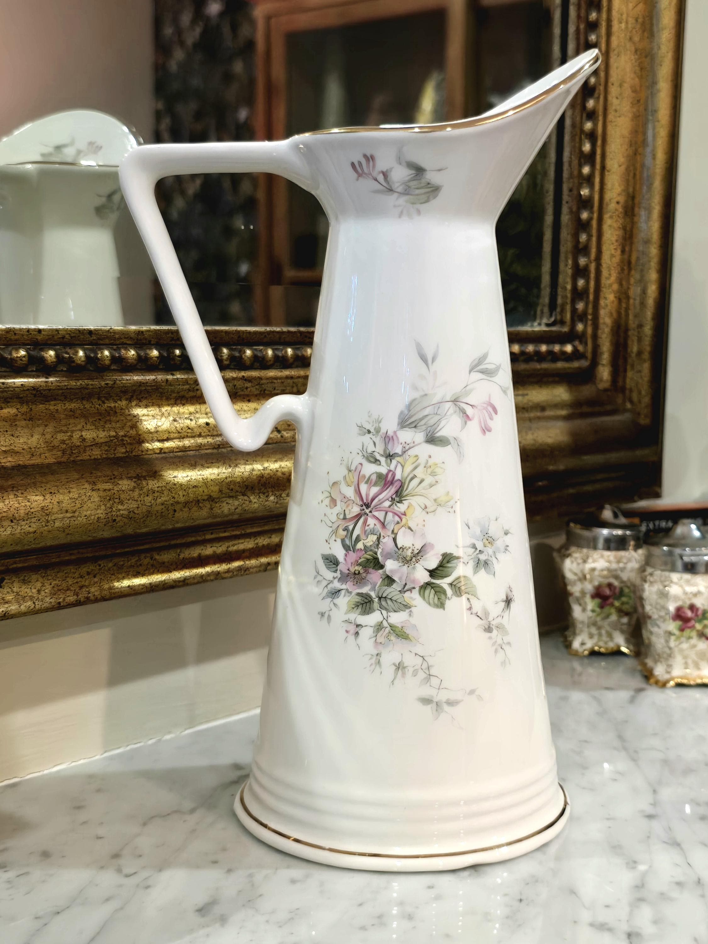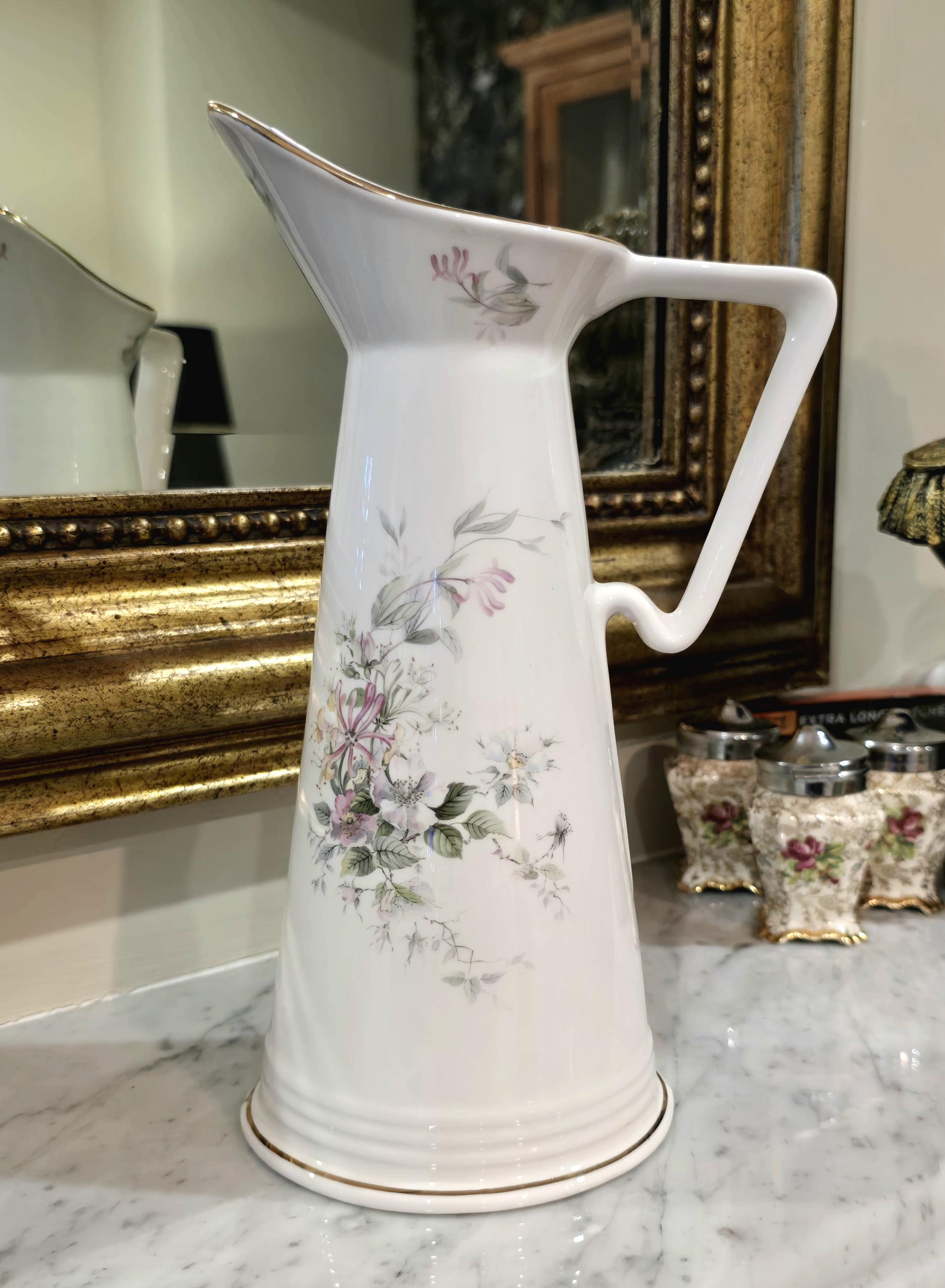 A tall, elegant ceramic pitcher crafted in fine bone china by Norcroft, England. Standing at 27cm, this vessel features a wide spout, gracefully curved handle, and a delicate floral motif in soft pastels with green leaf accents. Its refined silhouette and gentle detailing evoke a sense of quiet ceremony, ideal for display or gentle use.