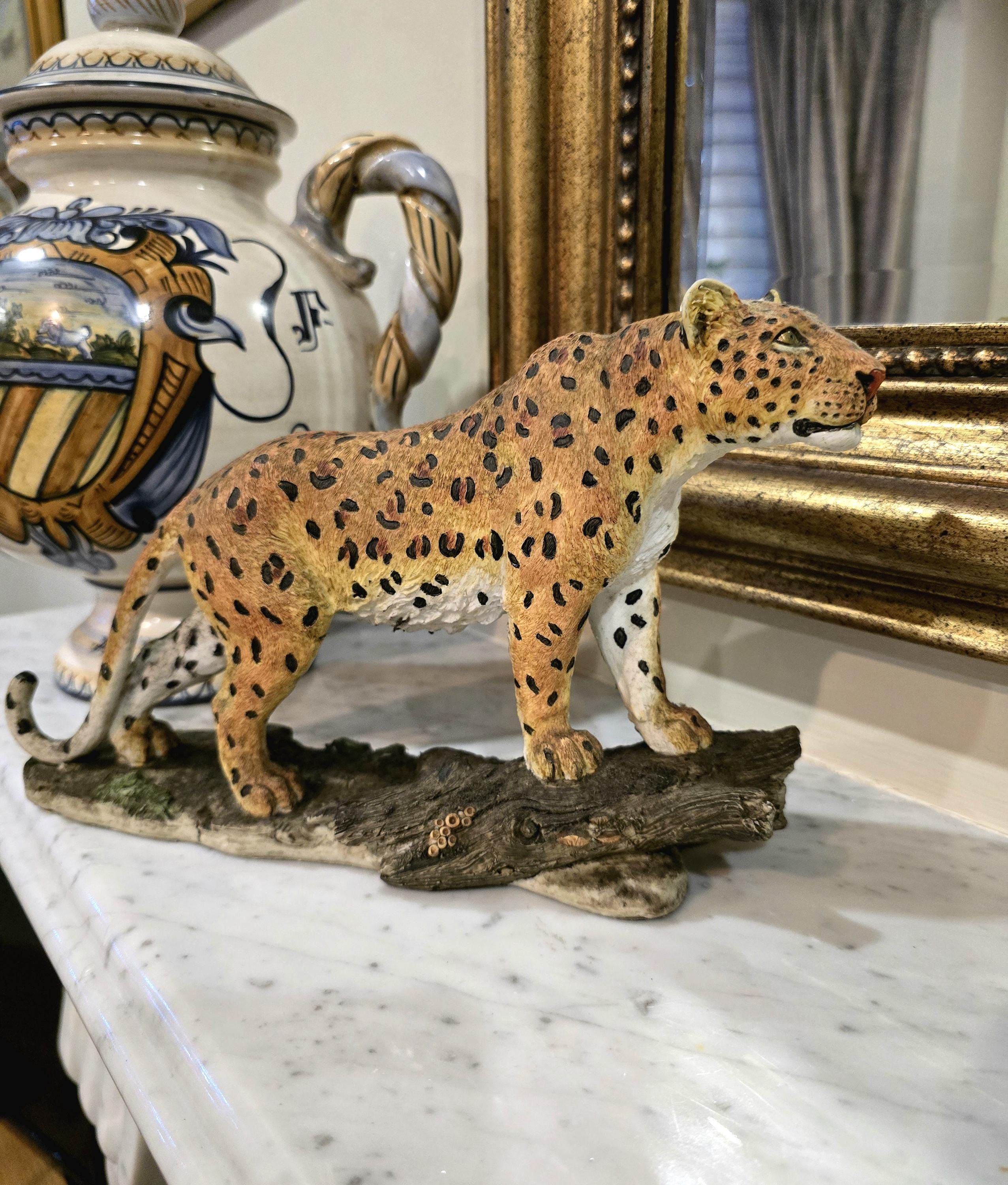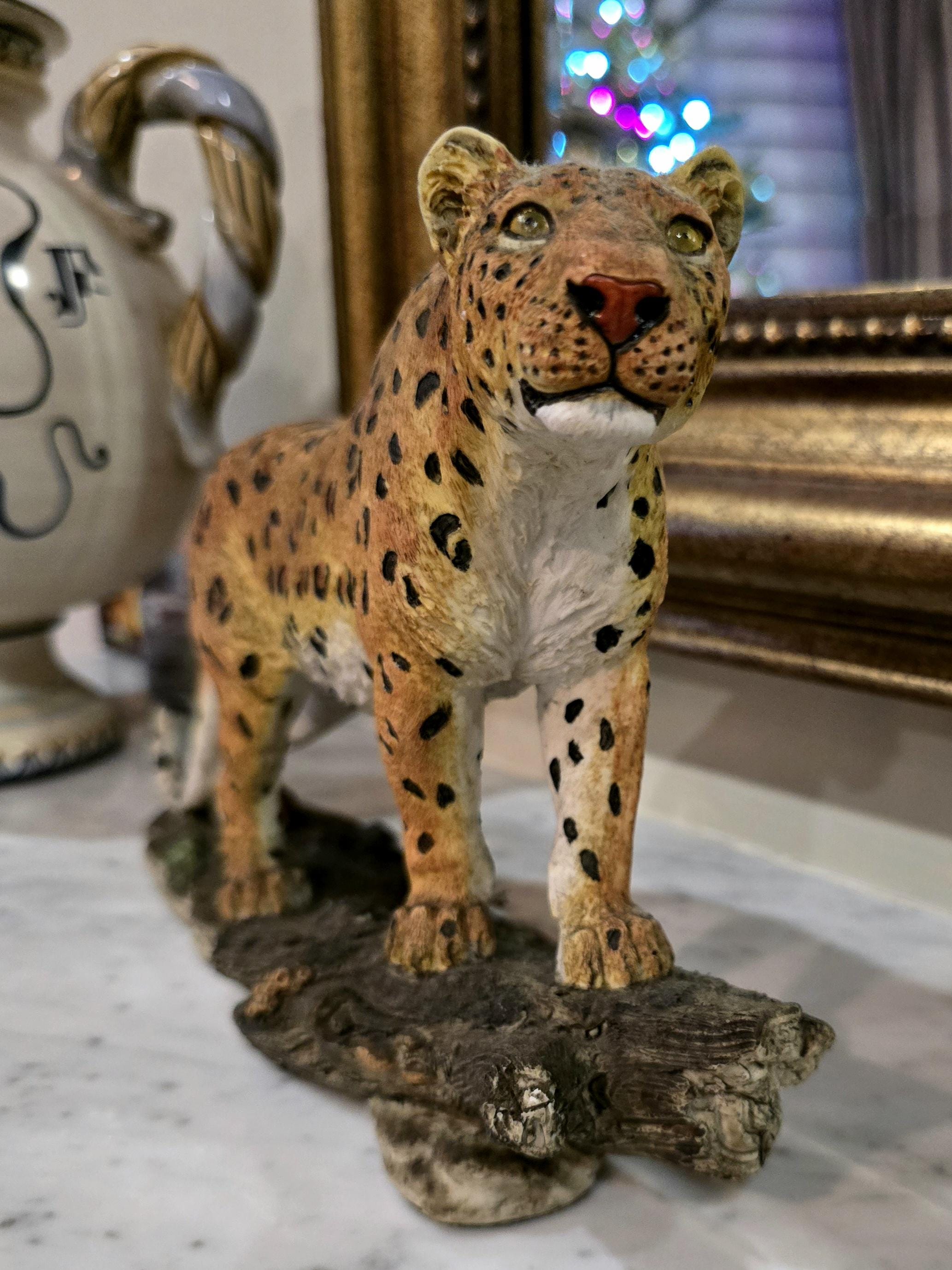 Realistic Resin Leopard Figurine – 10" Long, Wood-Style Base