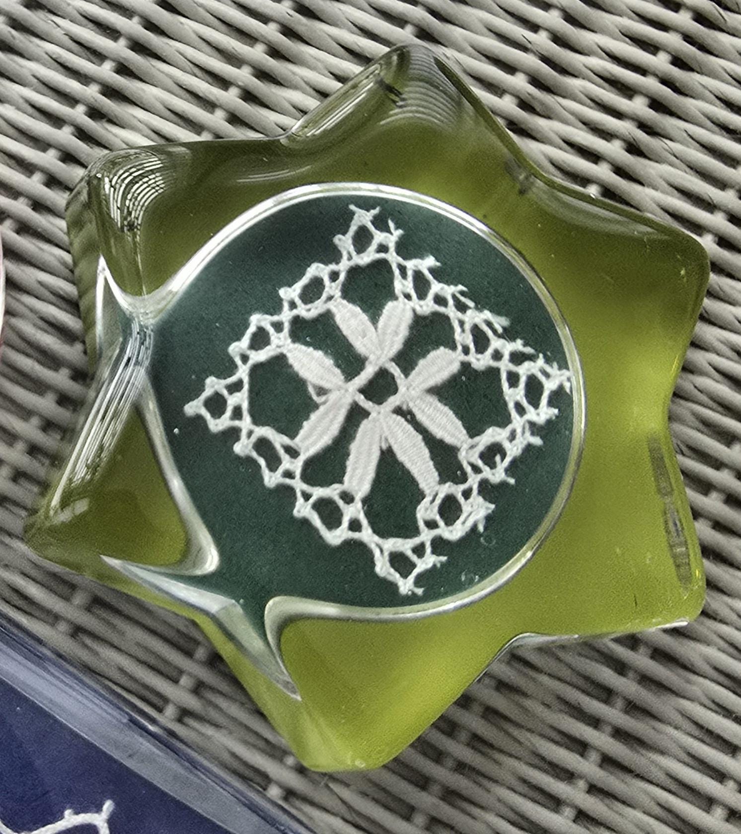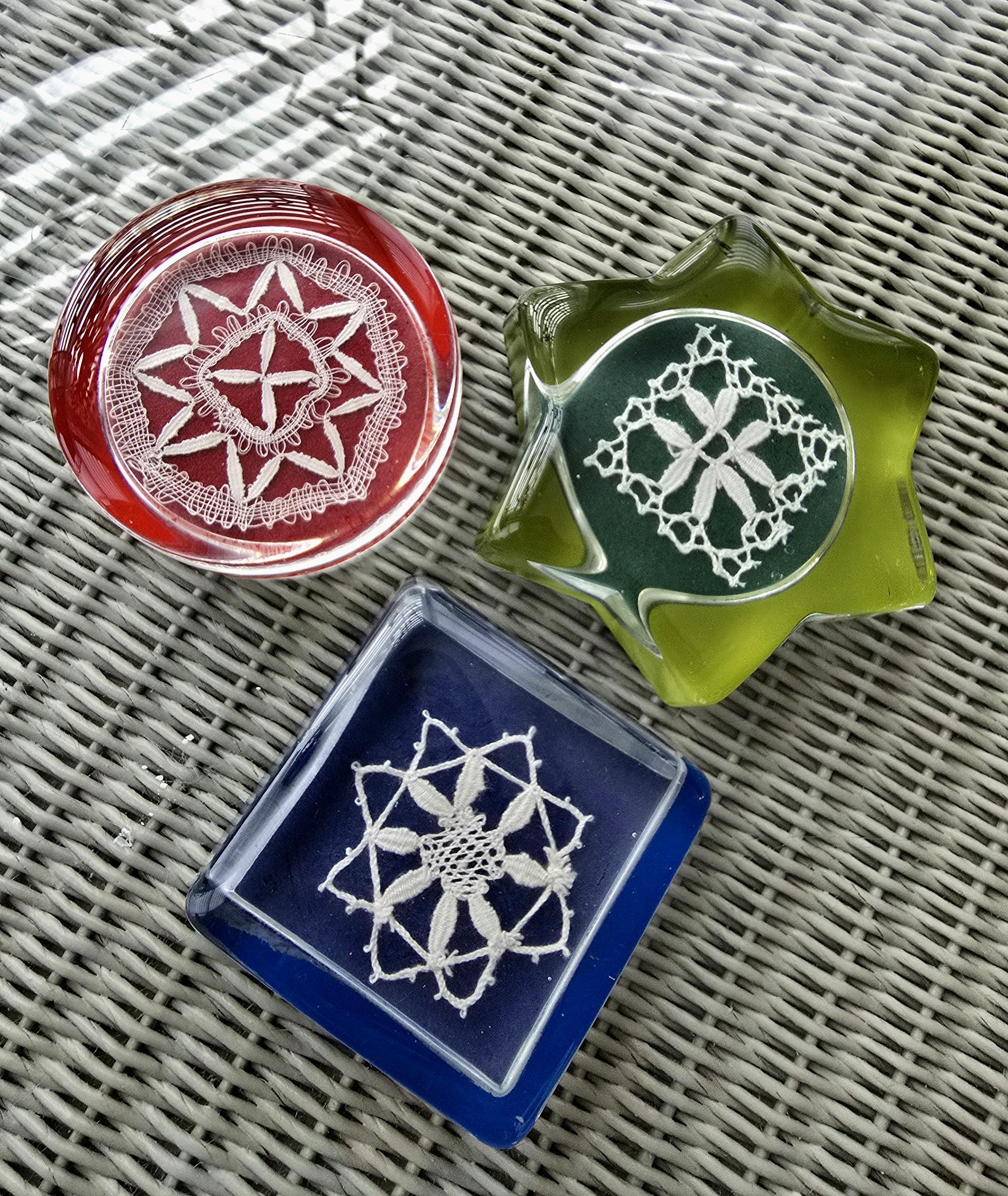 A set of three vintage glass paperweights, each paperweight encasing delicate white lacework within richly coloured glass. These pieces blend textile artistry with the clarity and weight of glass—perfect as desk companions, shelf accents, or gentle gifts.