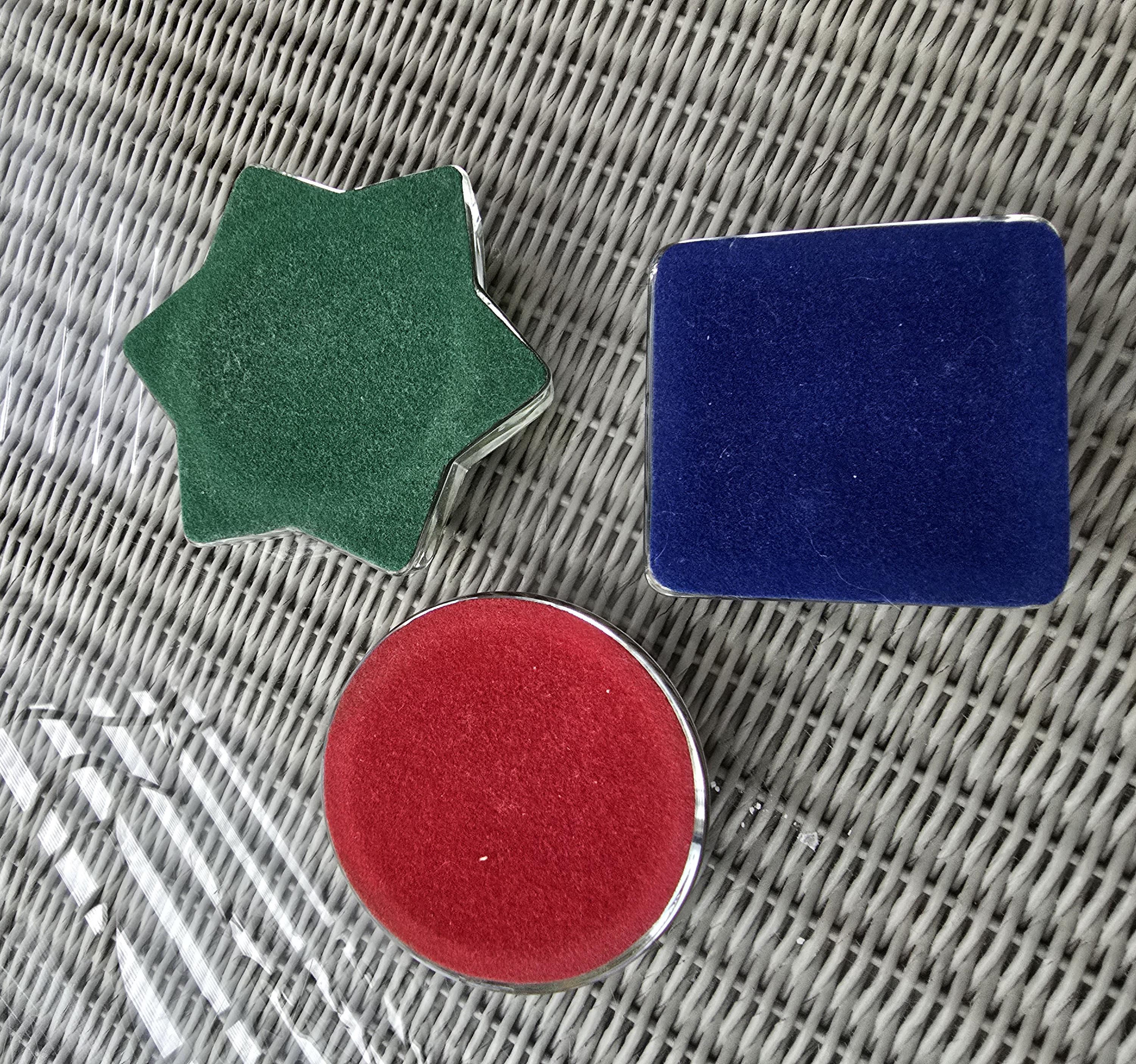 - Red Round – A circular dome of ruby glass cradling a star-flower lace motif with a central diamond.