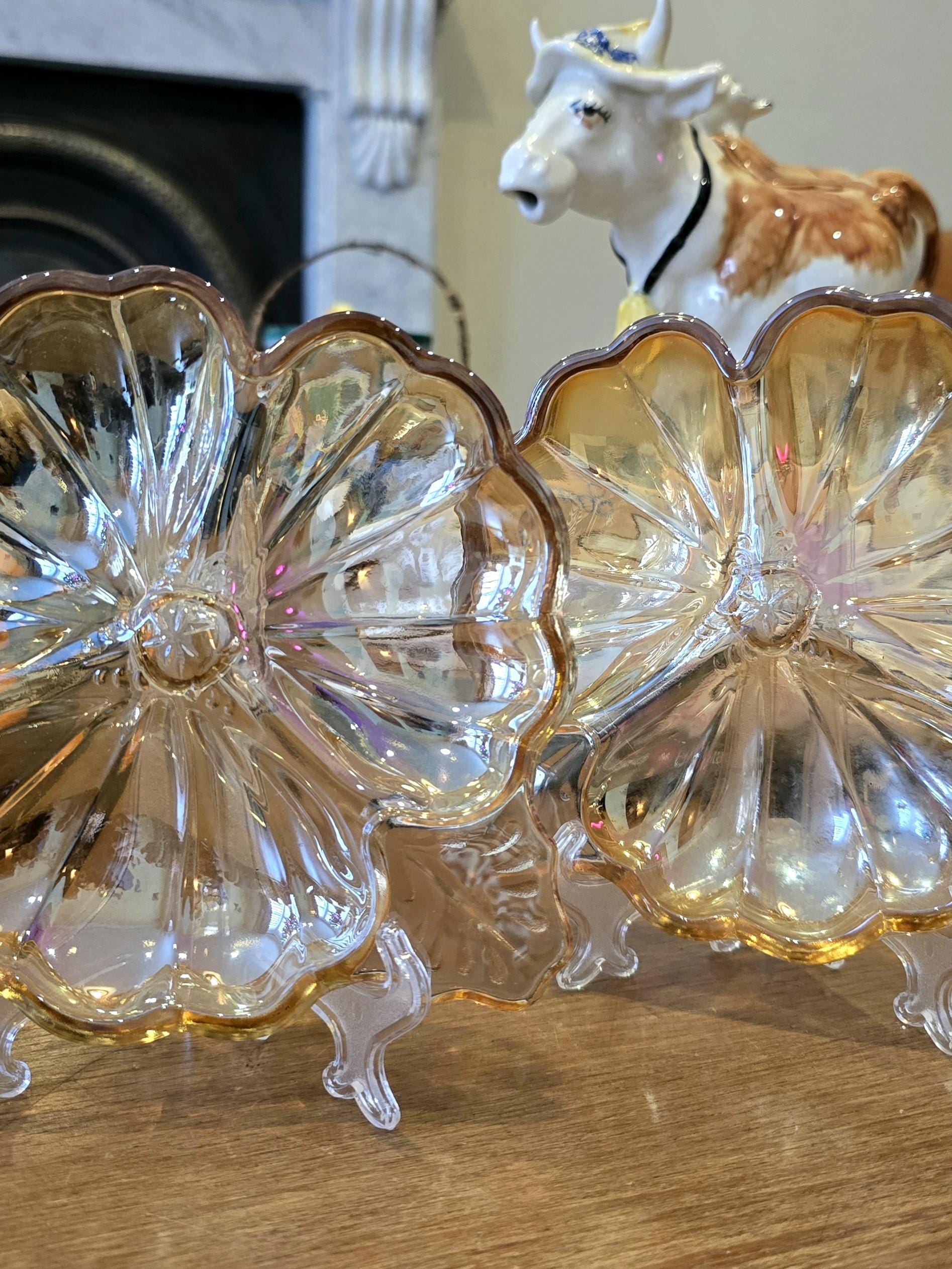 Two vintage dishes, shaped like open blooms and kissed with rainbow light. Their iridescent finish—known as Carnival glass—shifts gently from gold to violet, echoing the glamour of early 19th-century pressed glass. Each dish holds a quiet shimmer, perfect for trinkets, sweets, or nibbles.