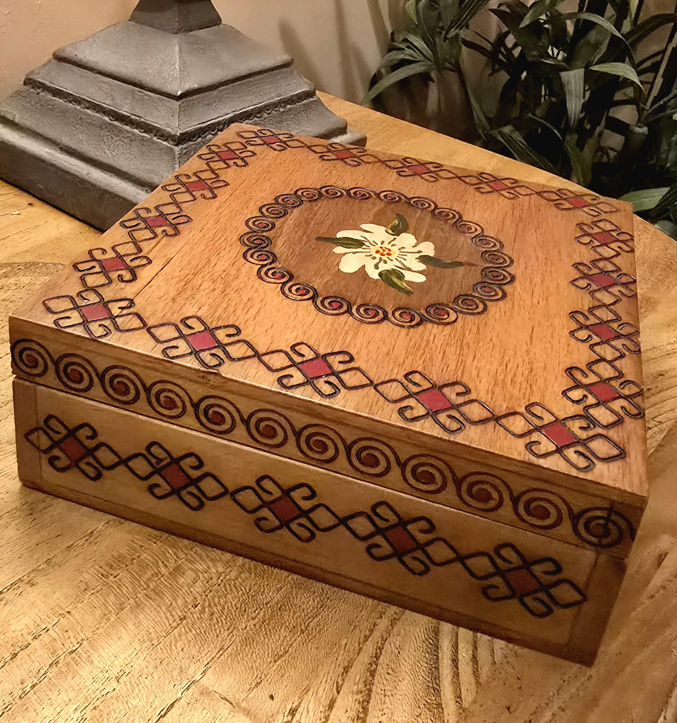 A striking vintage wooden box with timeless appeal. Measuring 17 x 17 cm, this handcrafted piece features a central floral spiral motif framed by a bold geometric border in rich plum and red tones. The design is both decorative and distinctive—ideal for collectors, stylists, or anyone seeking a unique storage solution.
