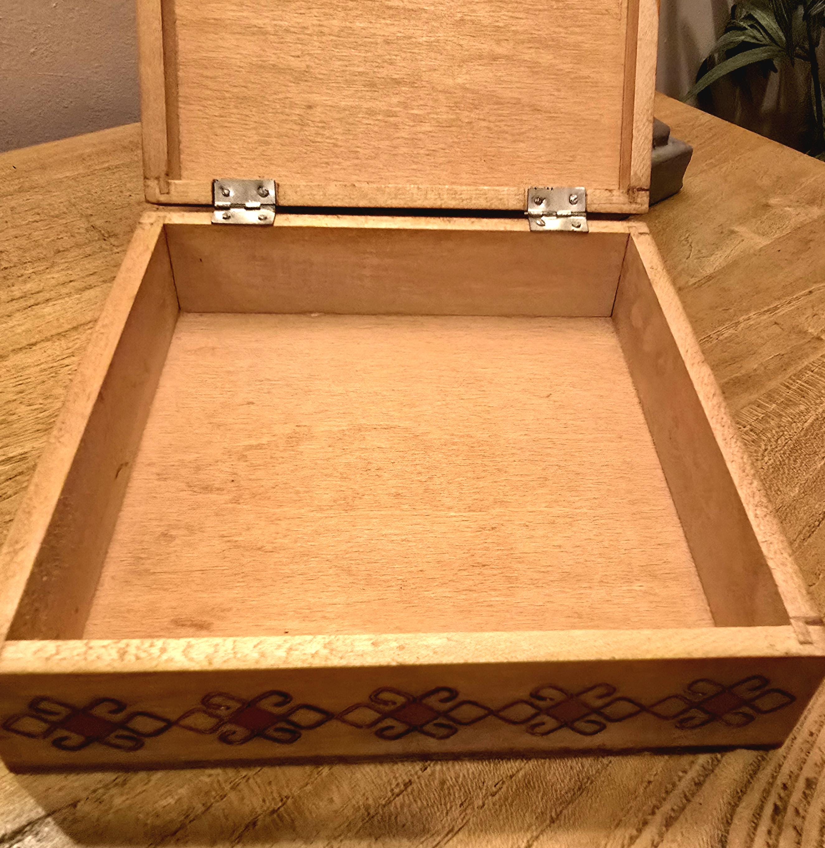 The box opens on sturdy metal hinges to reveal a clean, natural wood interior—perfect for storing jewellery, keepsakes, or small essentials. The side panels echo the lid’s geometric pattern, adding visual continuity and charm.