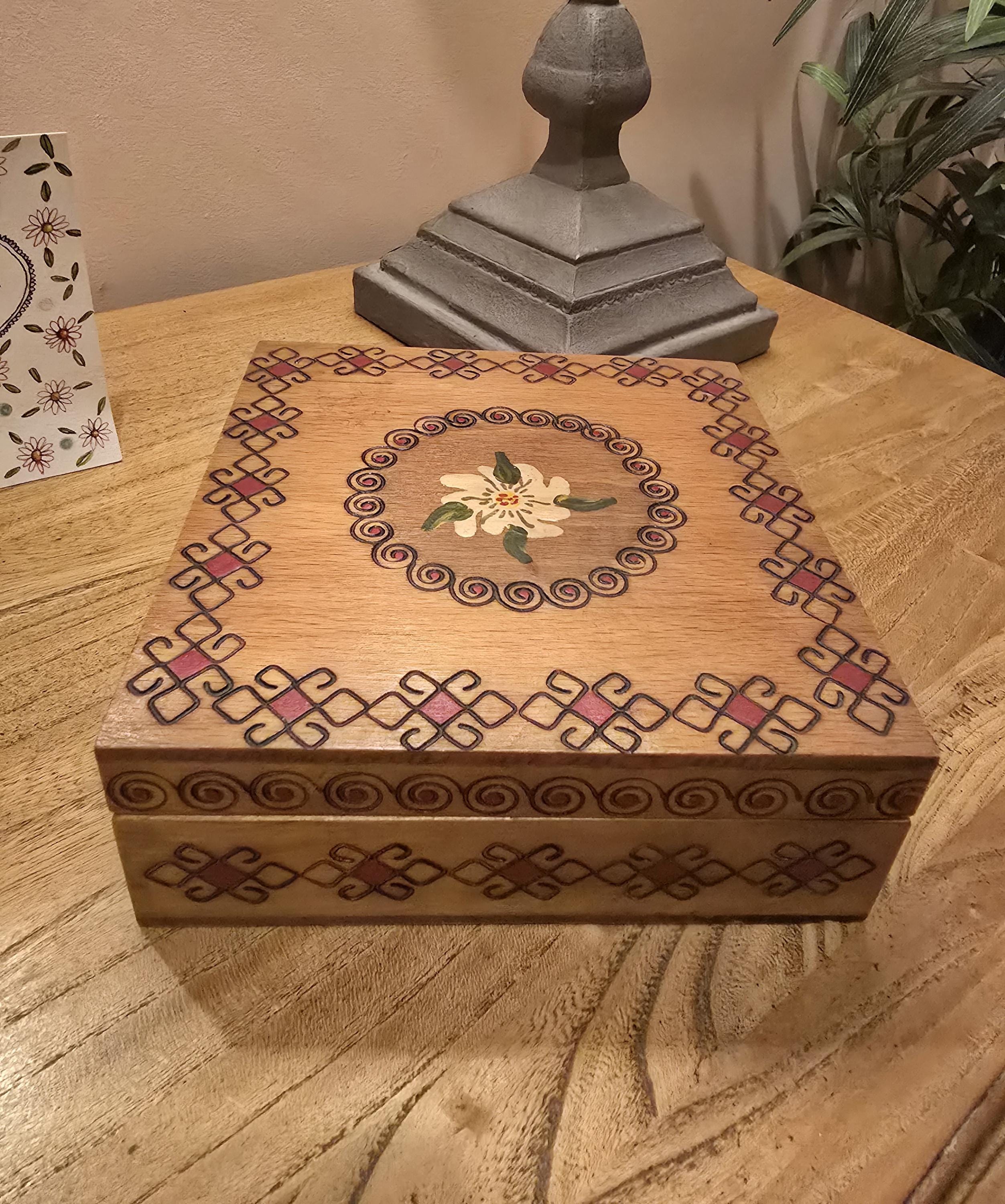 Small Vintage Floral Wooden Trinket Box: 1970s Boho Jewellery Box