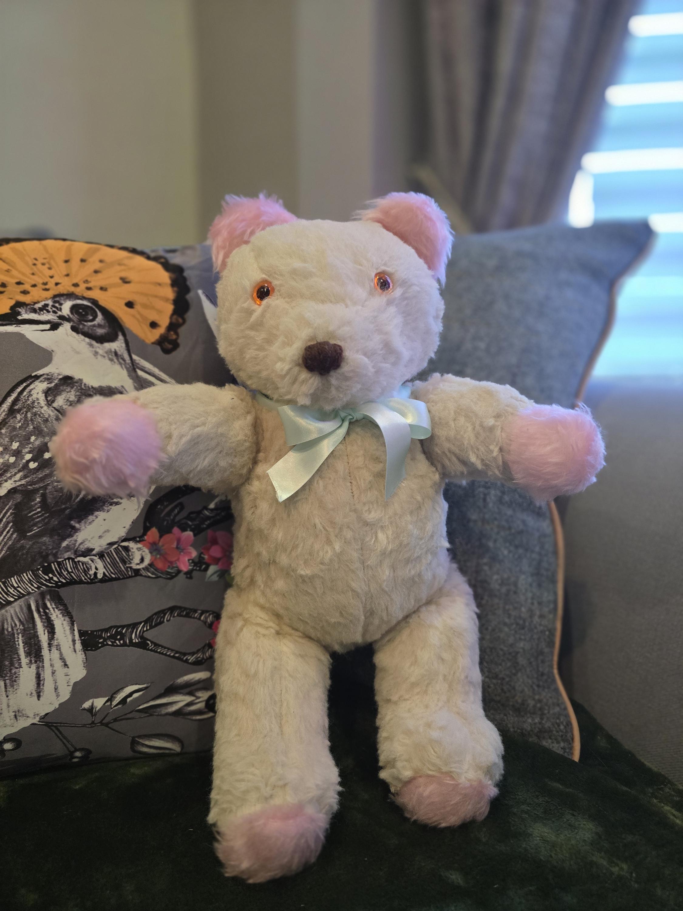 🌸 Wishes to be known as Miss Petalouda – Vintage Standing Teddy Bear with Pink Accents – 18" Companion with Blue Ribbon.