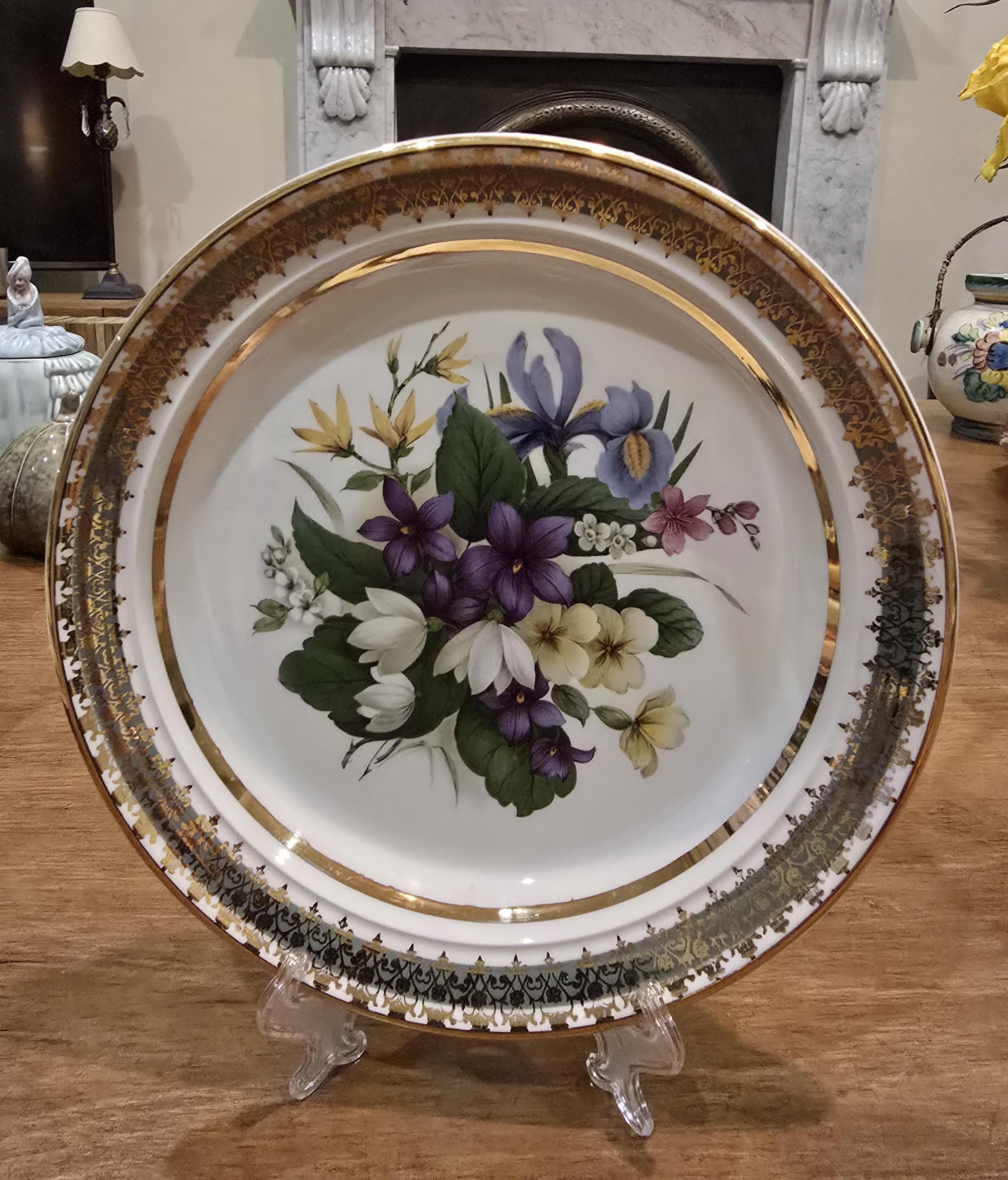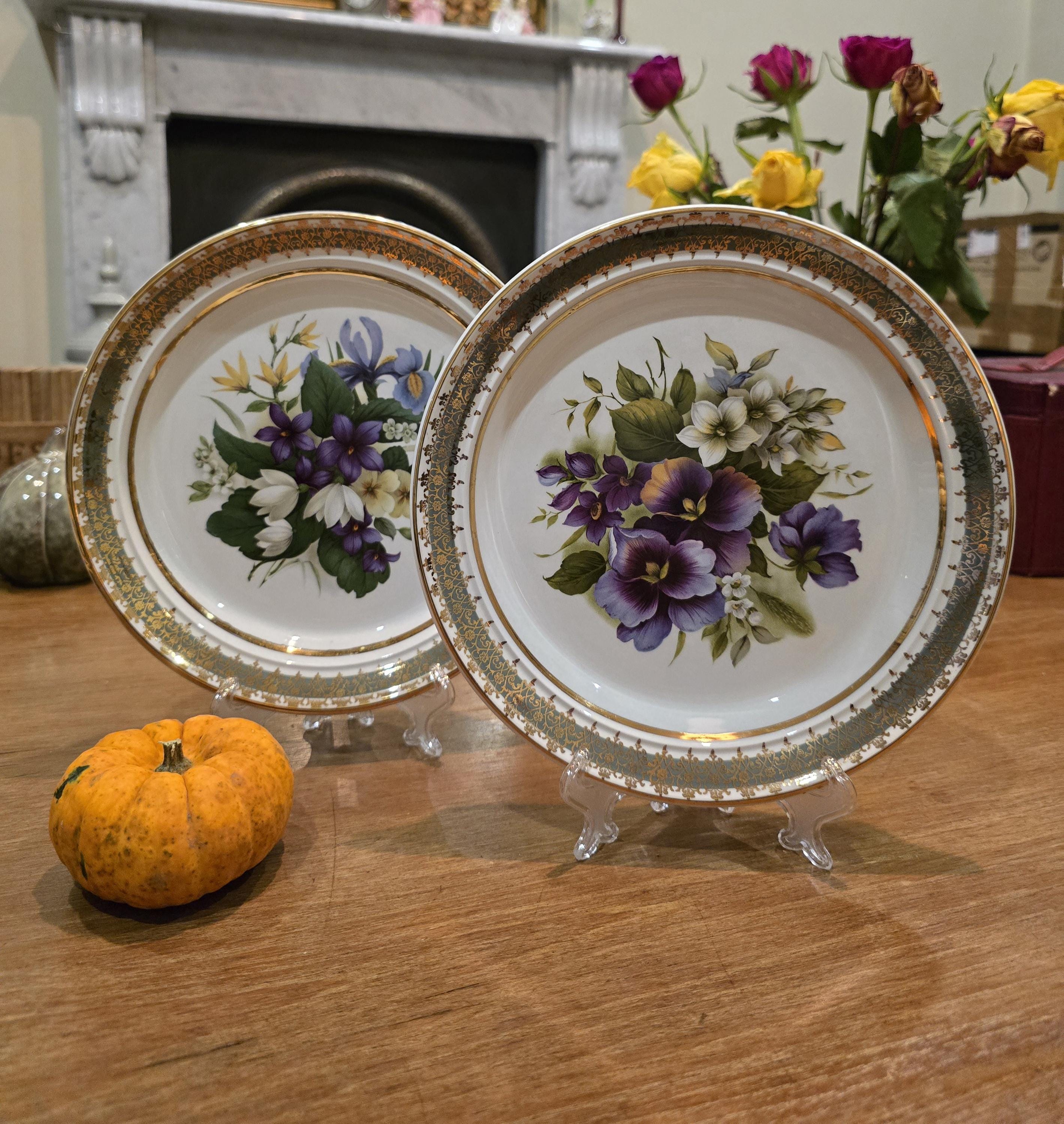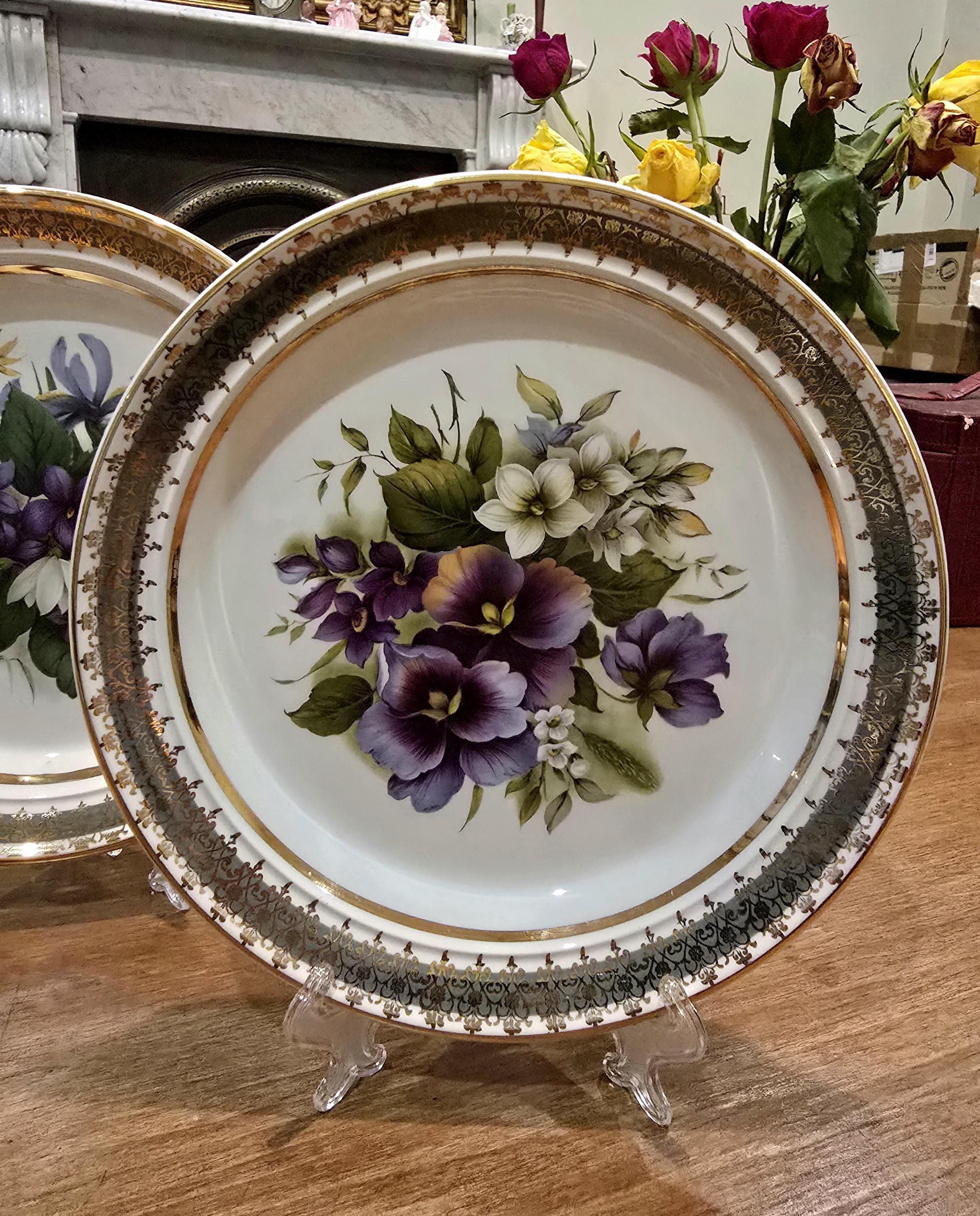 A sanctuary in porcelain. These vintage plates feature exquisitely delicious floral bouquets —violets, irises, and pansies in shades of purple, white, and yellow—framed by intricate gold and black detailing along the rim. A quiet celebration of botanical grace and fine craftsmanship. What's not to love ...