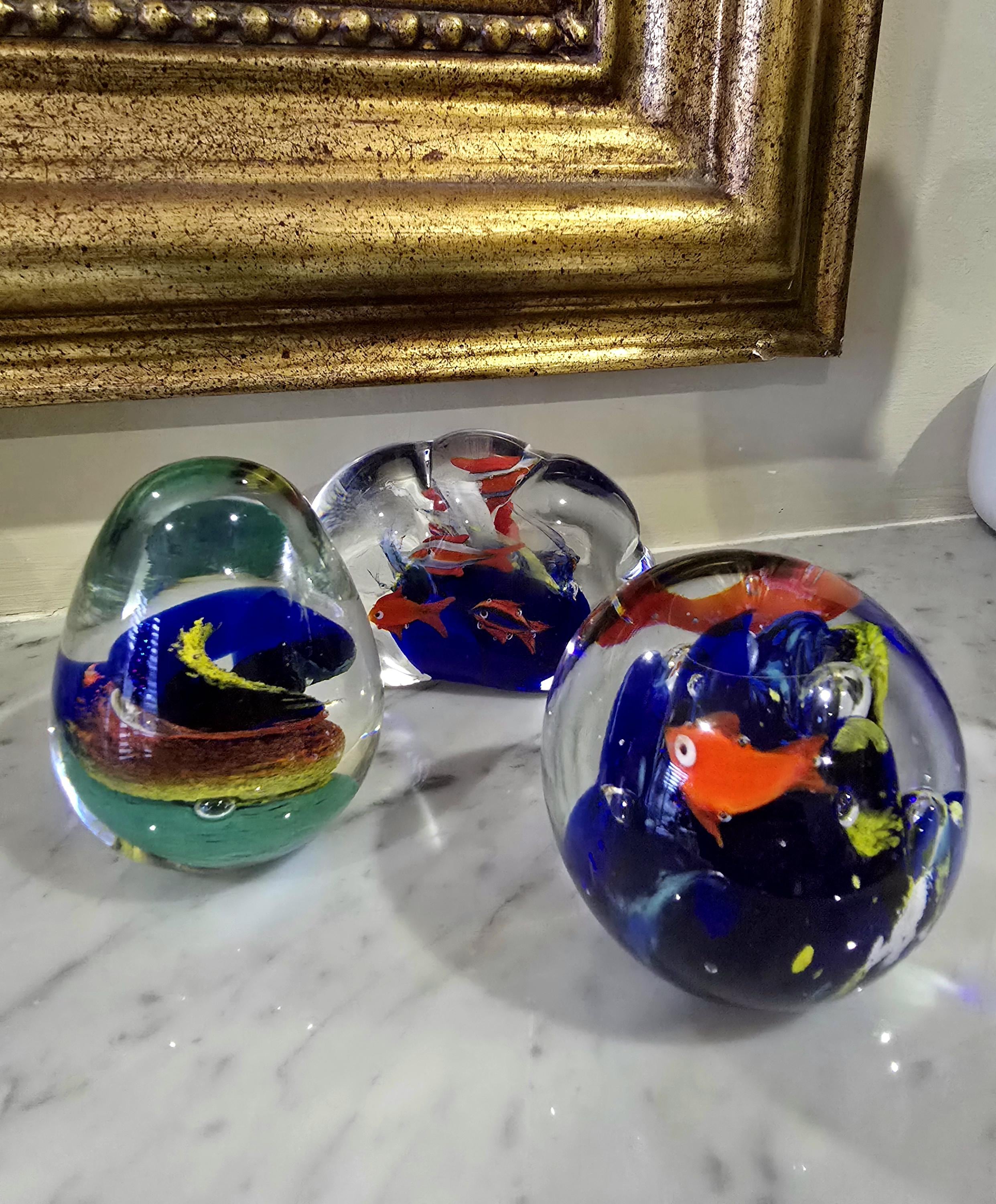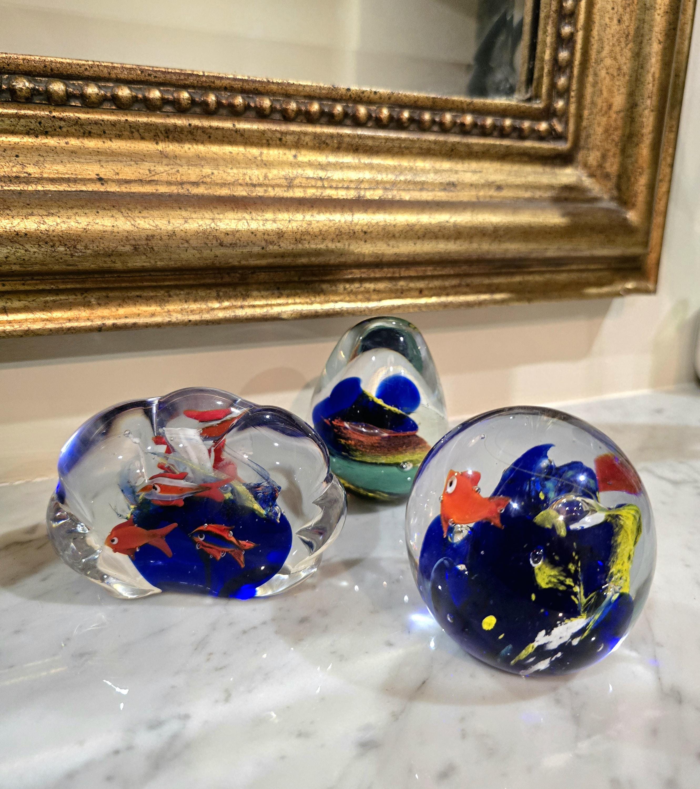A sanctuary offering from The Plum Dish: three vintage glass paperweights, each a miniature aquarium of stillness and story. Suspended within clear, rounded forms, vibrant fish swim among abstract coral and oceanic swirls—orange, cobalt, saffron, and seafoam held in timeless pause.