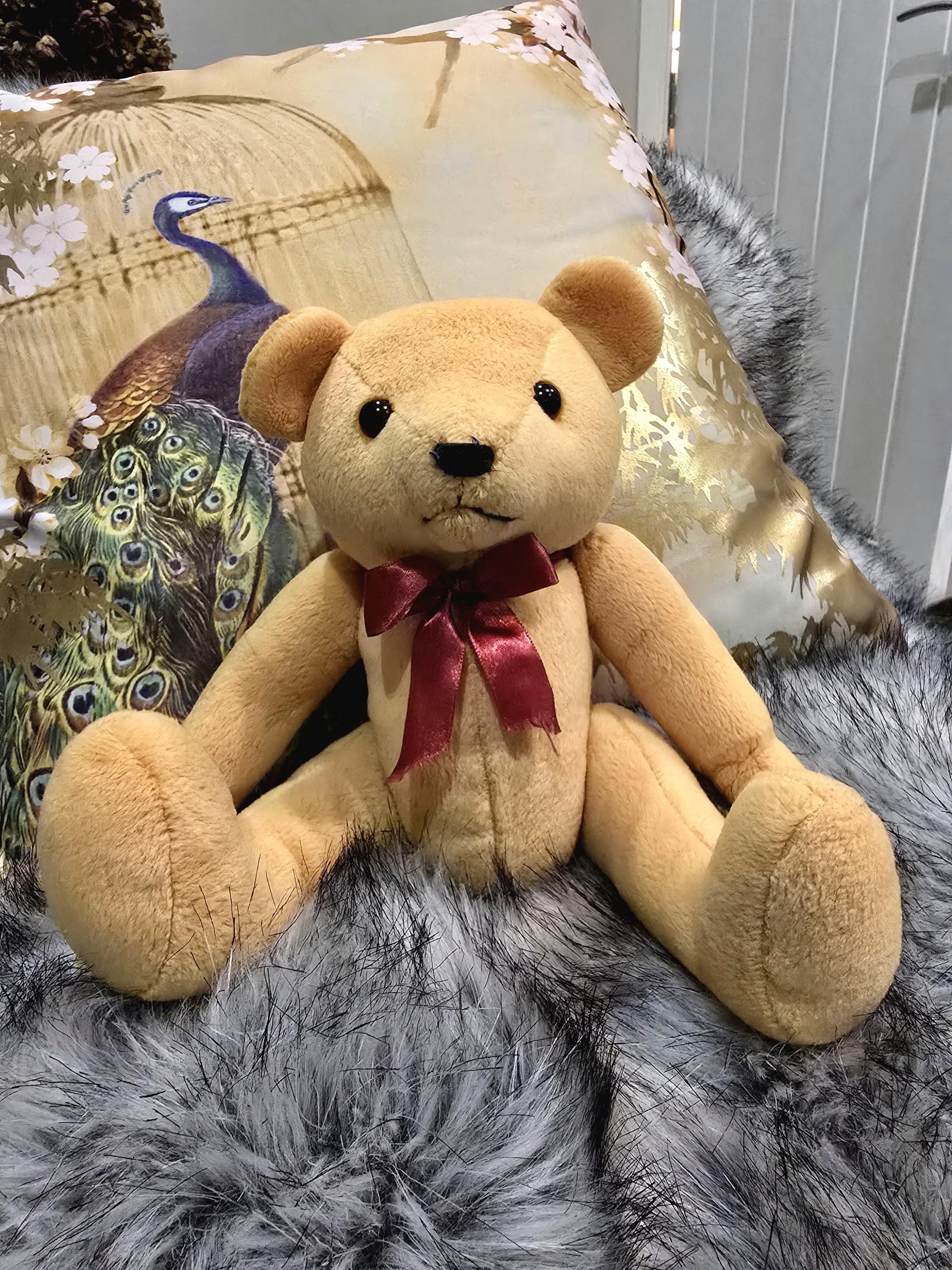 He stands 13 inches tall, limbs jointed and freely moving, with a soft light brown plush body and stitched features that speak of sincerity. His deep red satin ribbon is tied with intention—no spectacle, just presence.