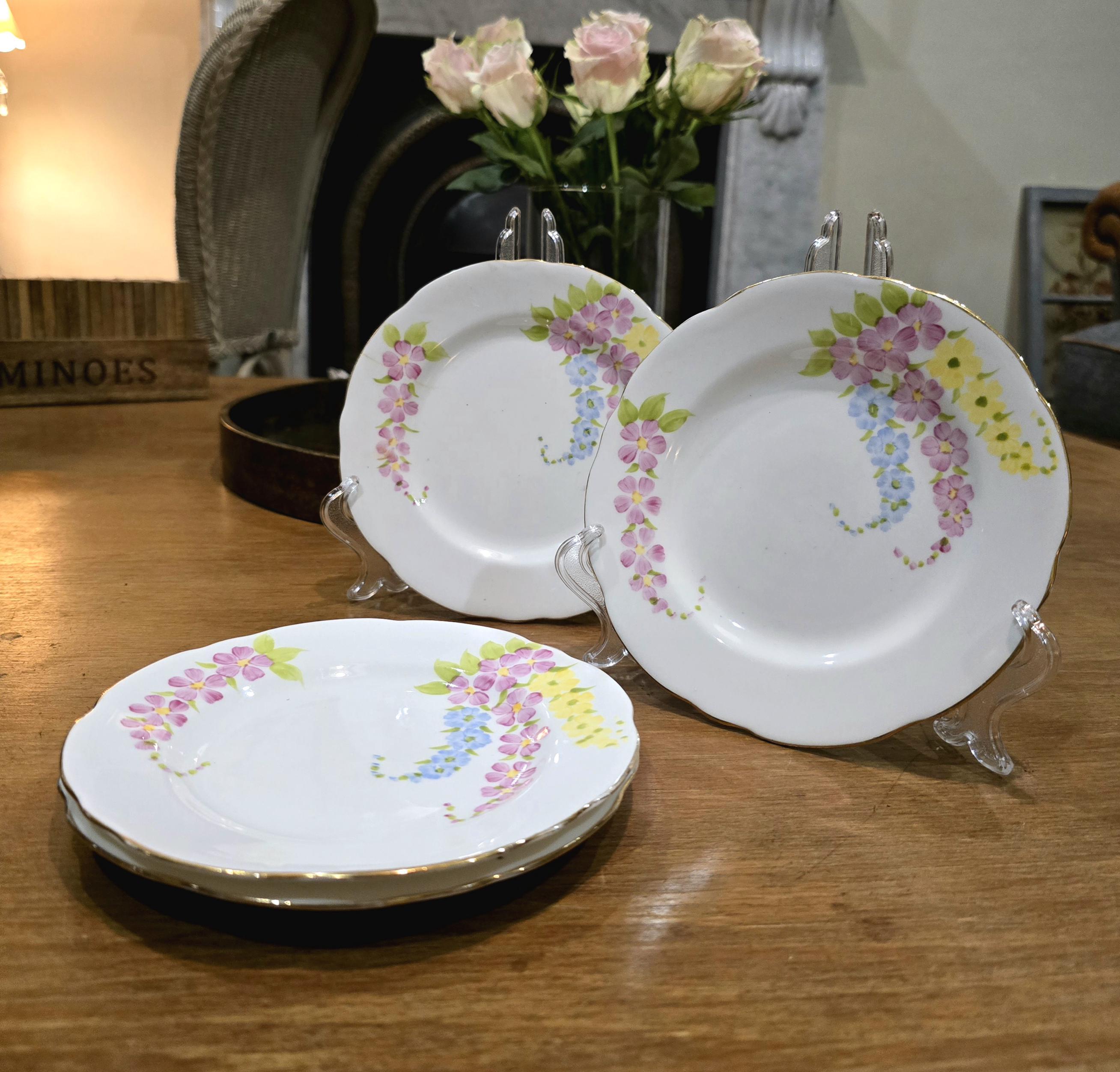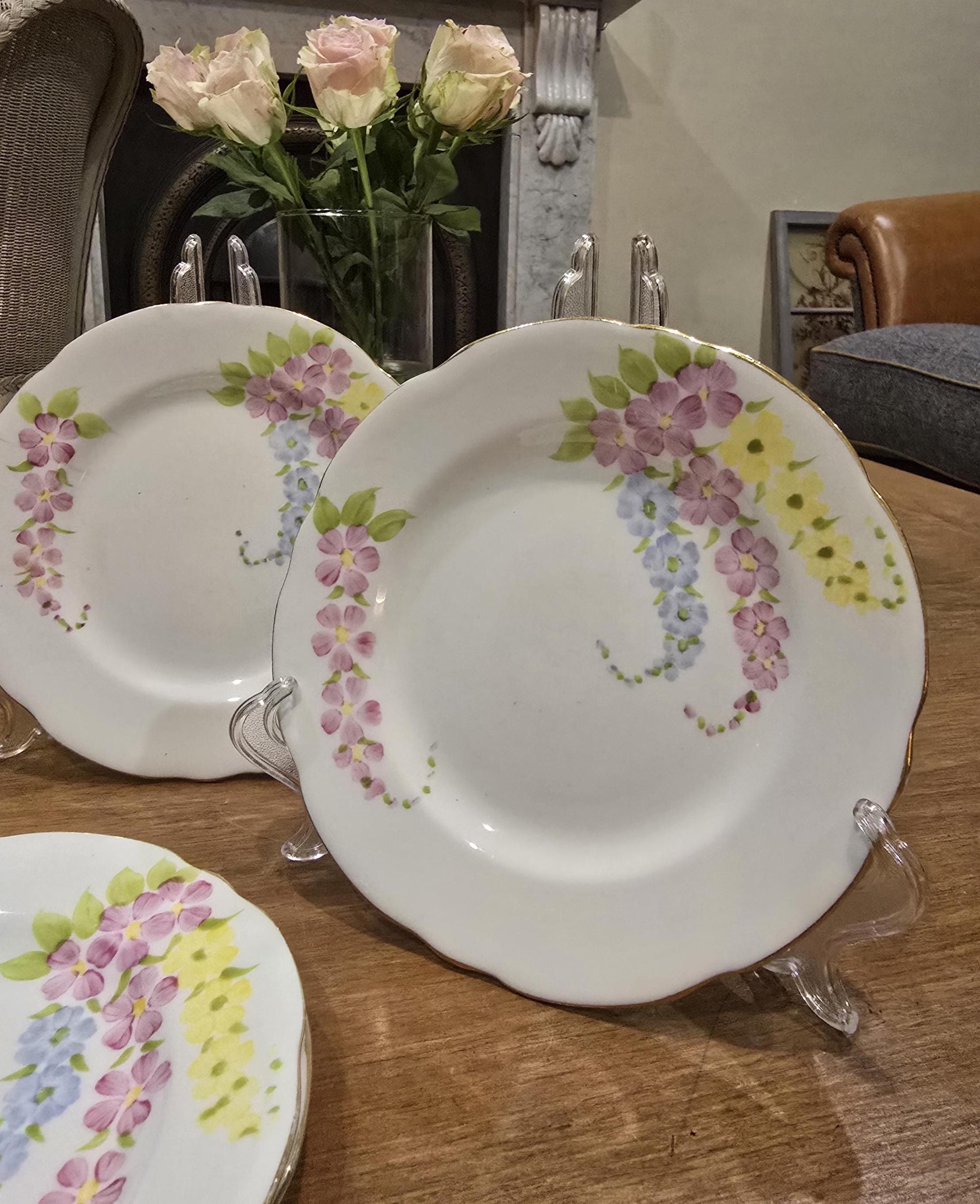 A gentle quartet of porcelain side plates, each rimmed with a cascade of pink, purple, blue, and yellow florals. Scalloped edges lined in gold add a whisper of elegance. No maker’s stamp—just quiet beauty and timeless grace.