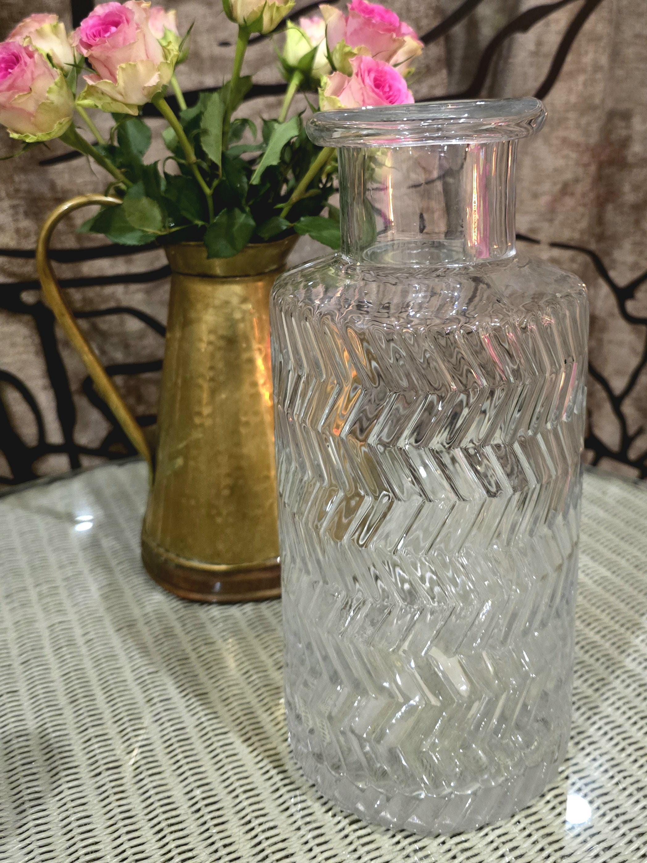 ​Standing at a commanding 12 inches tall, this vase features a sophisticated textured herringbone (chevron) design that catches and refracts light beautifully. Its classic apothecary-style neck and cylindrical body make it perfect for long-stemmed lilies, eucalyptus, or seasonal branches.