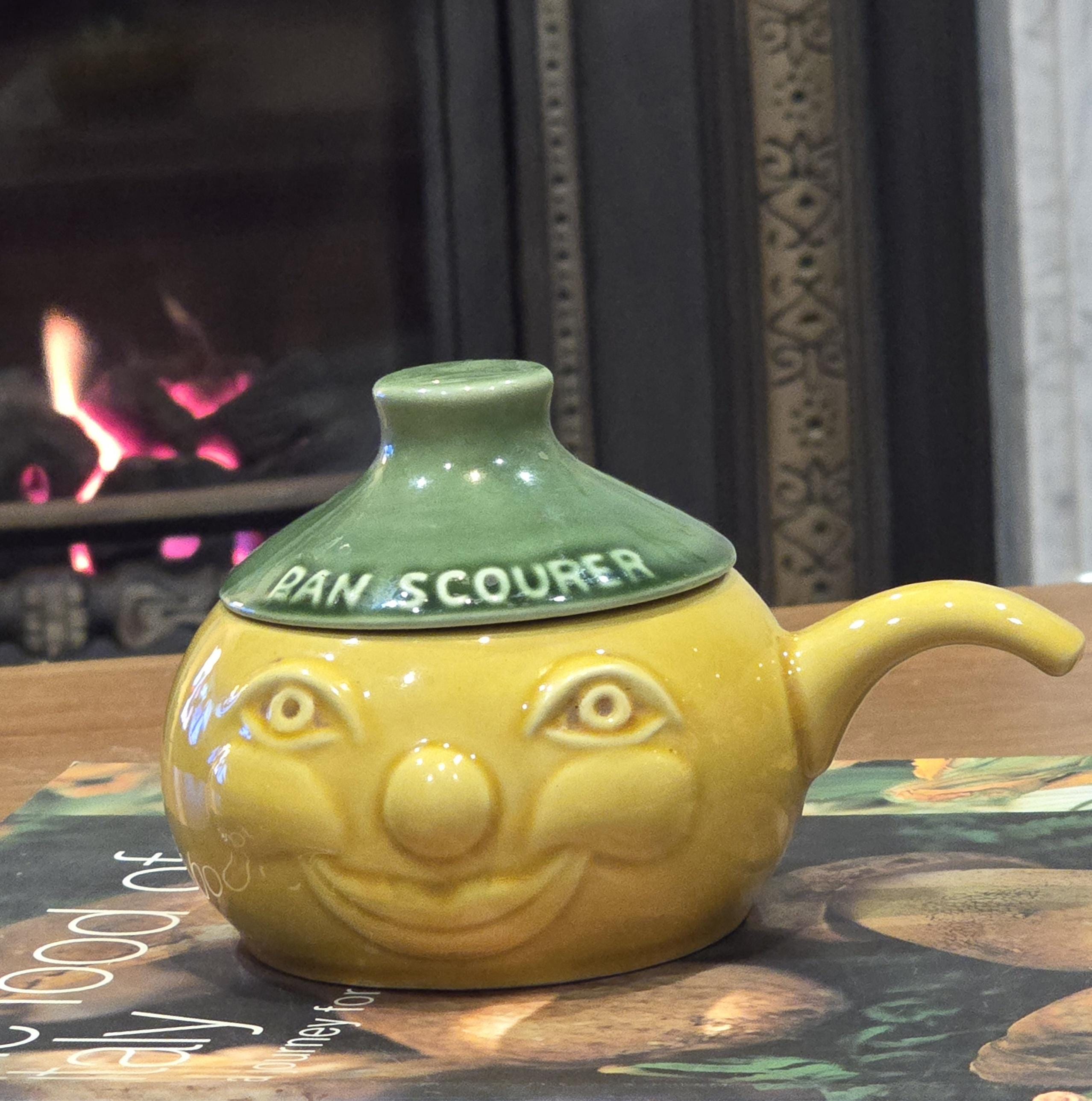 ​Part of the iconic anthropomorphic range by the famous British pottery company SylvaC, he features a cheeky, smiling face and a bright yellow glazed finish. The green lid is clearly embossed with "PAN SCOURER," designed to hold your wire wool or scrubbing pads in style.
