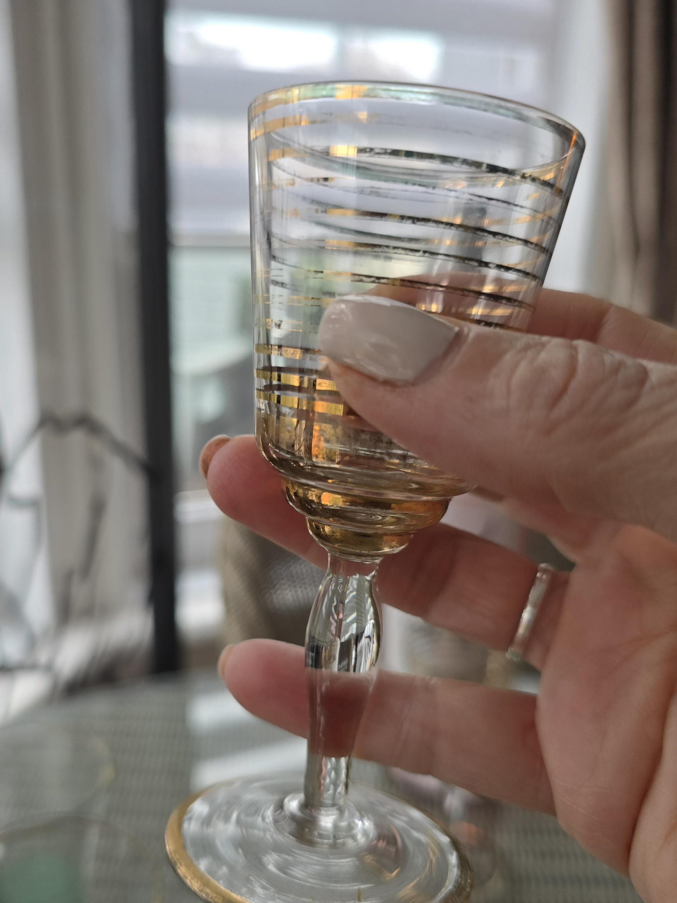​2 Cordial/Shot Glasses: Elegant stemmed glasses with a classic tapered bowl, decorated with a tight horizontal gold-ring pattern.