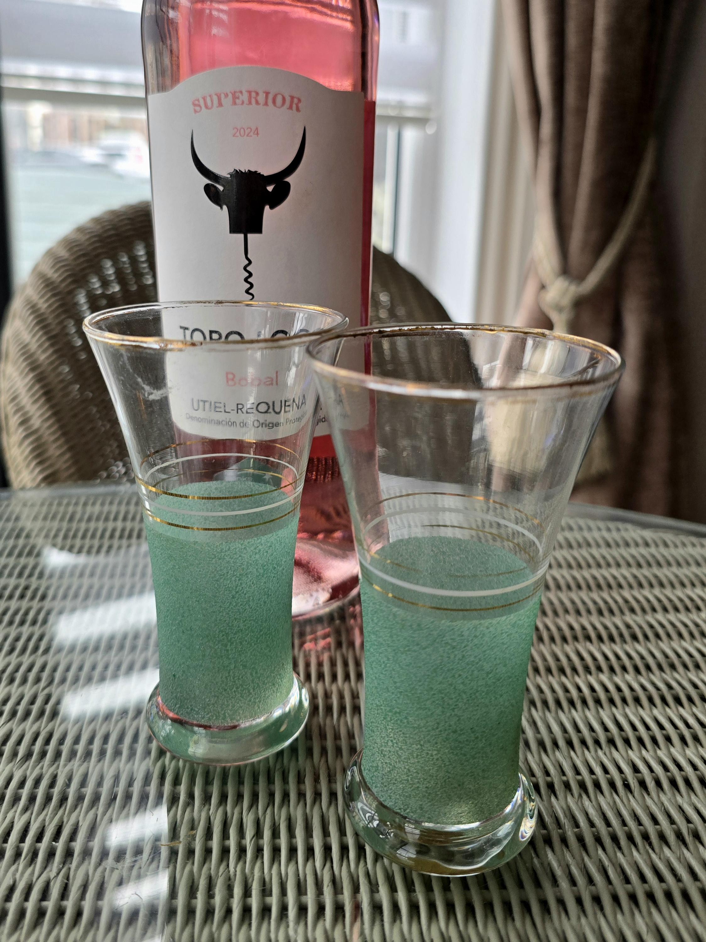 ​2 Teal Aperitif/Liqueur Glasses: A rare flared shape featuring a vibrant teal-green frosted base and delicate gold pinstripe accents.
