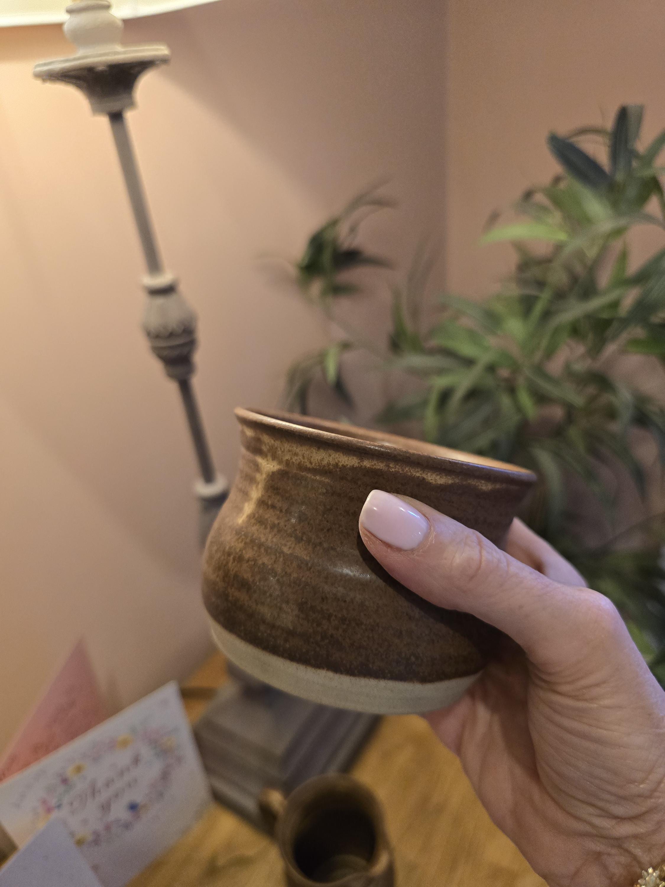 The Aesthetic: A striking, tactile 3-piece set perfect for a boho or mid-century styled home. The 10" tall pot has a wonderful presence, featuring hand-thrown ridges and a rich, "toasted" chocolate glaze.