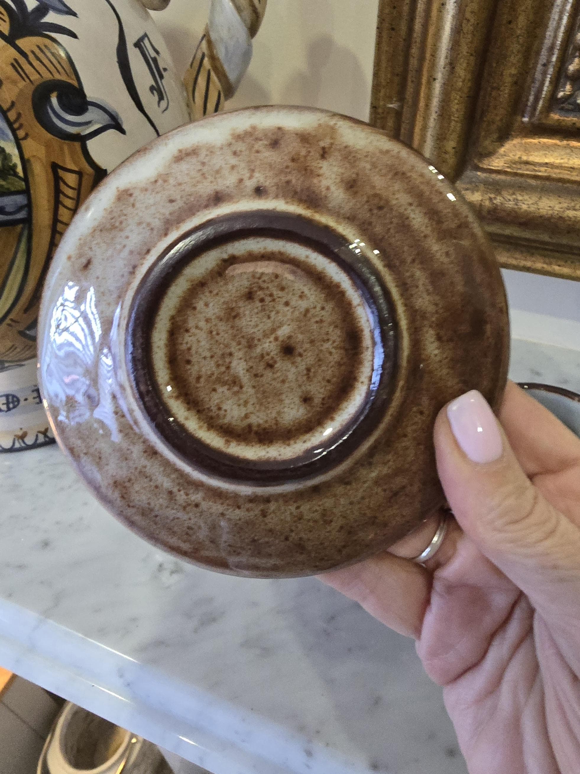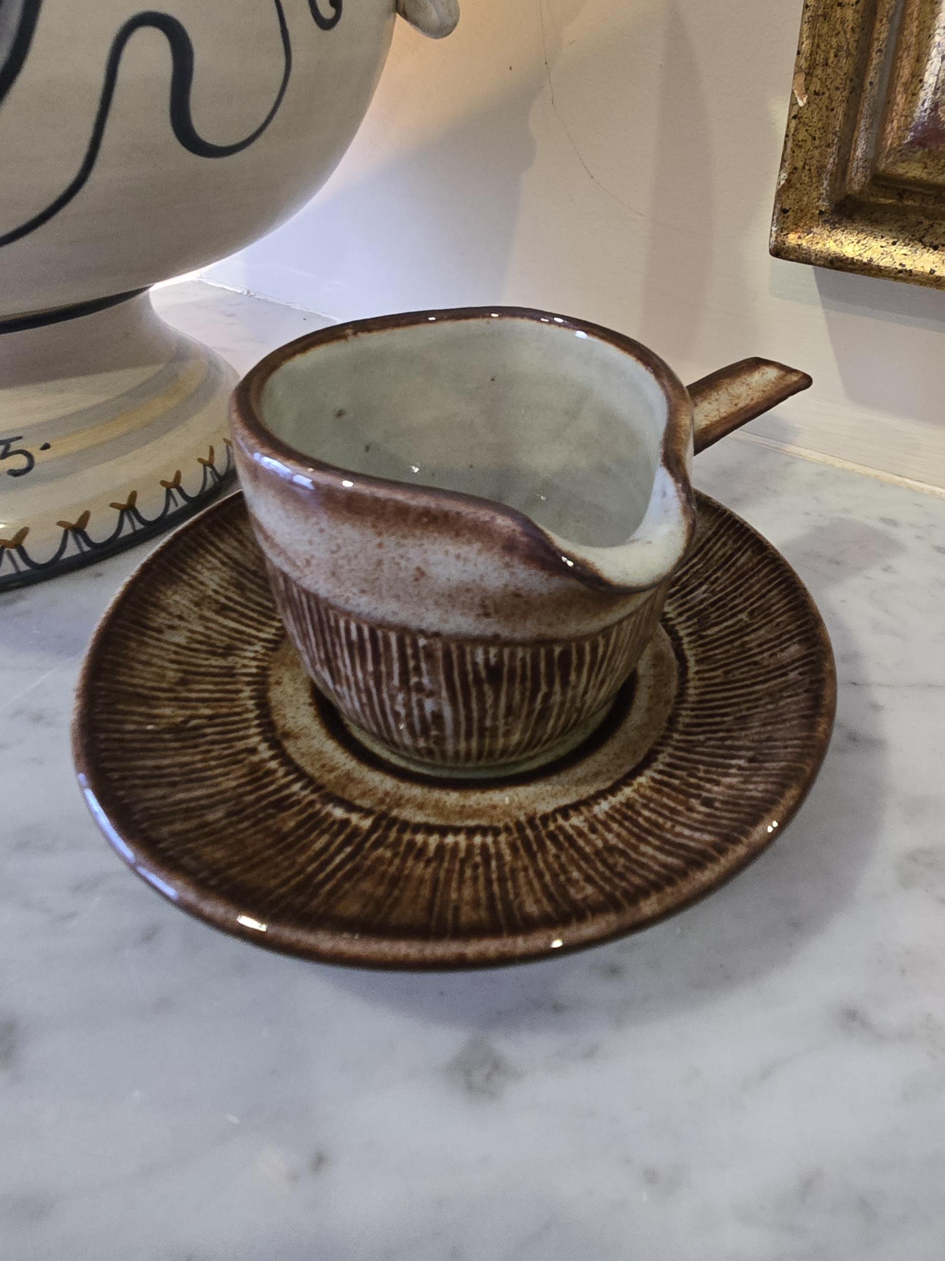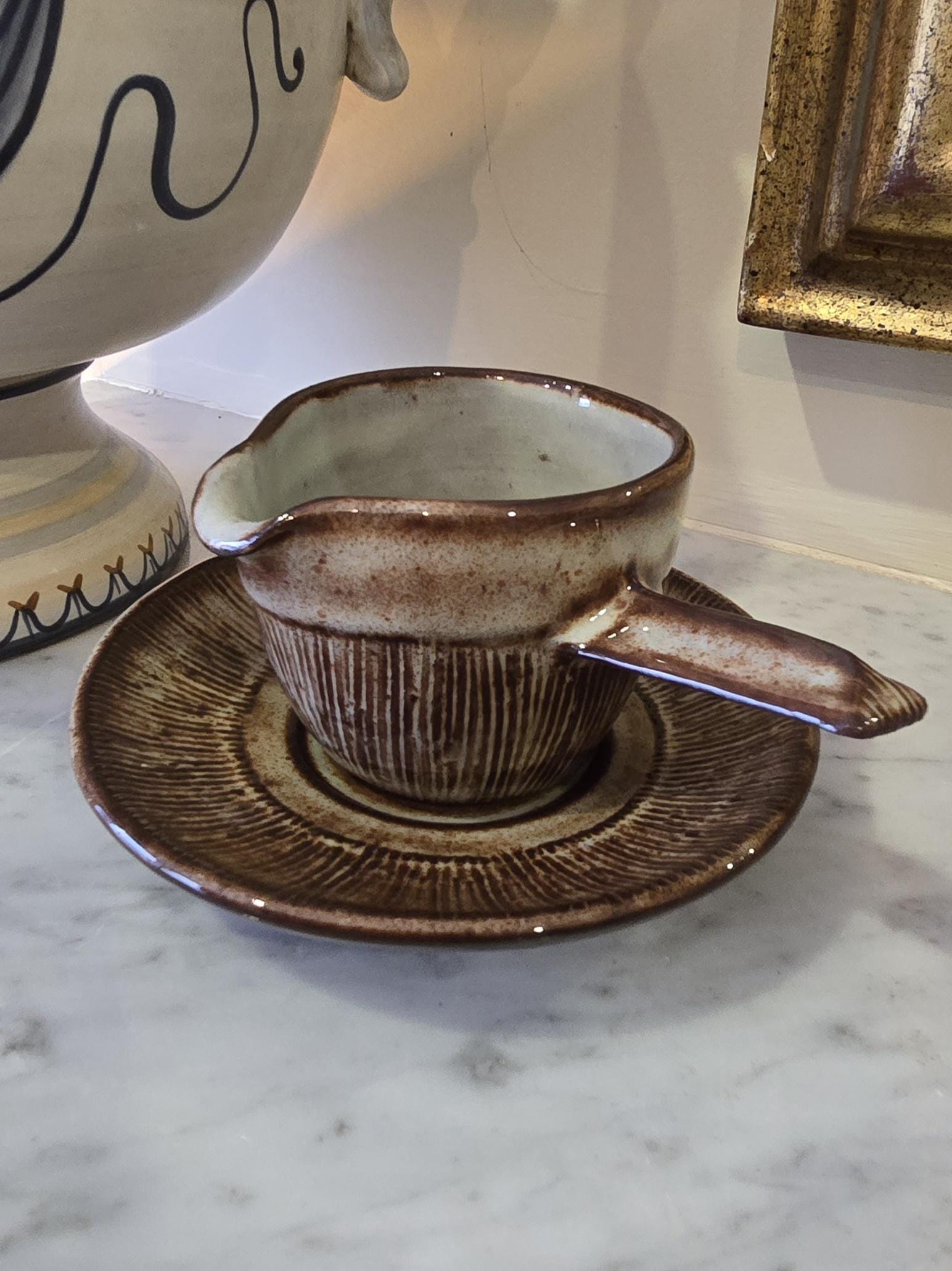 Add a touch of rustic Mid-Century charm to your table with this beautiful hand-finished studio pottery sauce boat and matching saucer. Featuring a distinctive horizontal handle and a deep, earthy brown glaze, this set is as functional as it is decorative.