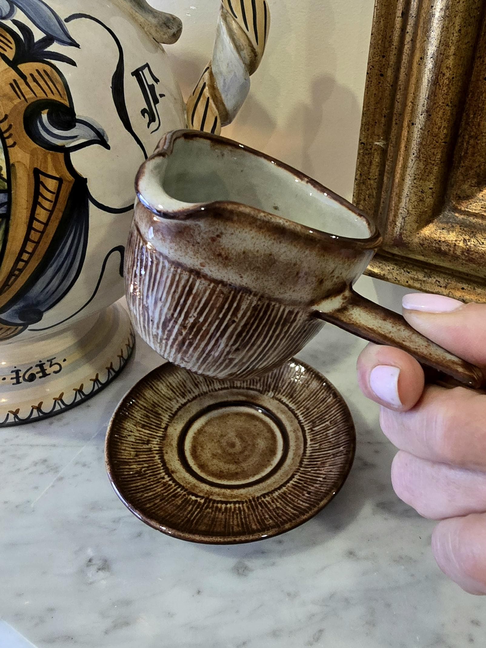 ​The piece is defined by its tactile, ribbed (sgraffito) texture on the lower half of the bowl and the face of the saucer, contrasting beautifully with the smooth, speckled glaze of the interior.