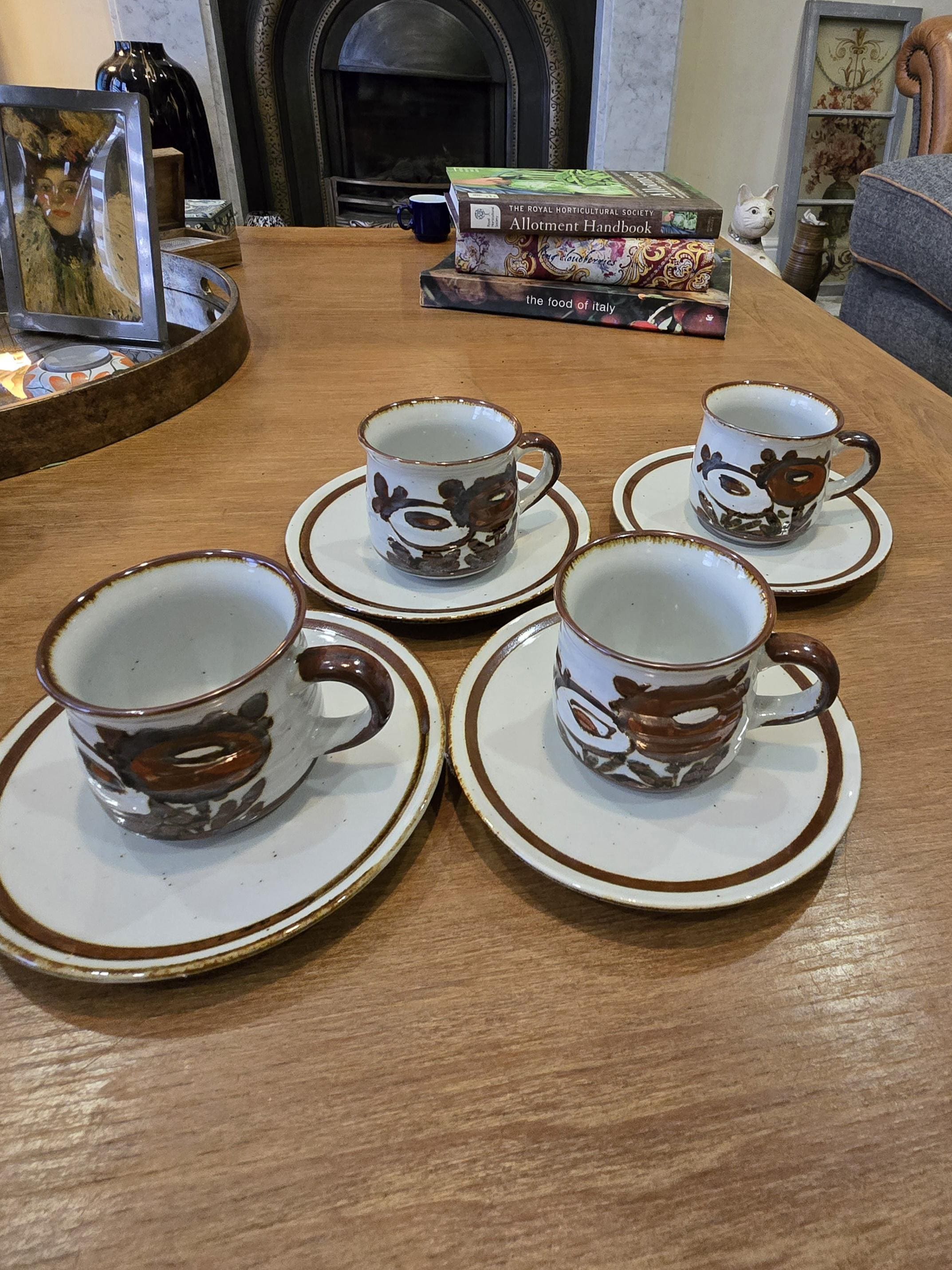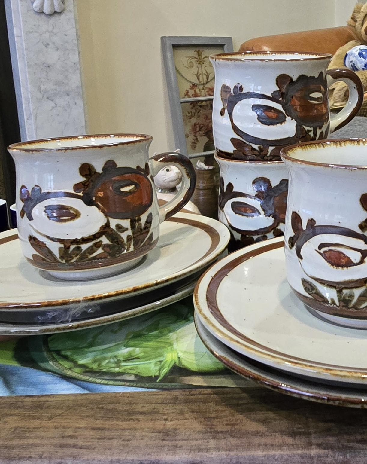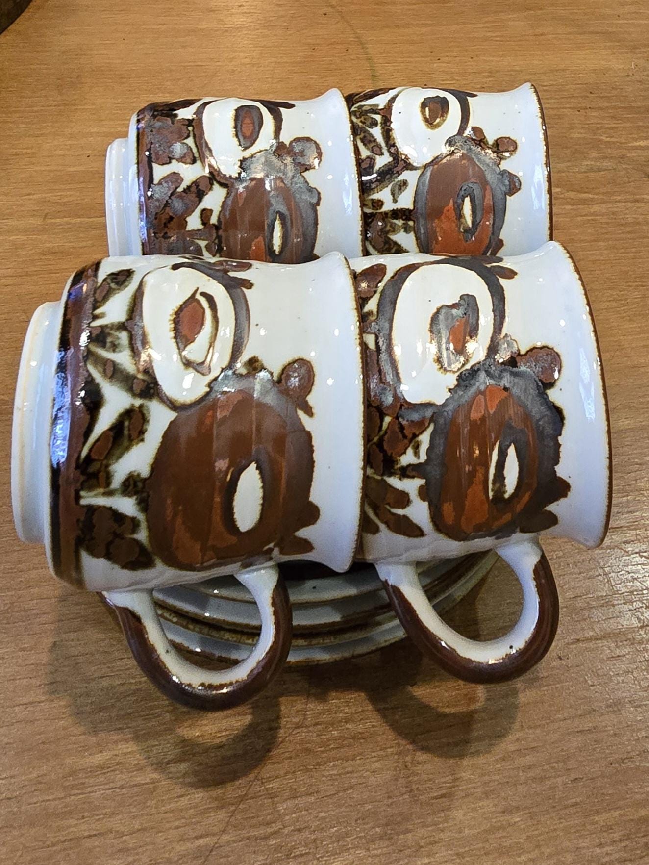 Add a touch of retro charm to your morning coffee with this beautiful set of four vintage Japanese stoneware cups and saucers. Featuring a striking, hand-painted abstract floral motif in earthy browns and creams, these pieces perfectly capture the 1970s Mid-Century aesthetic.