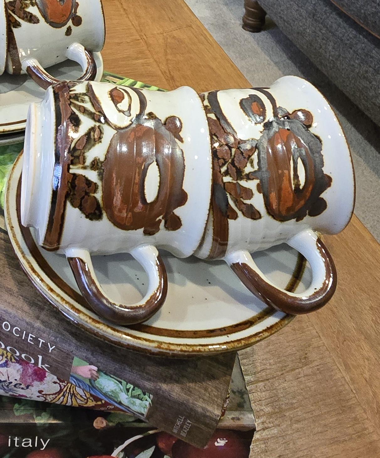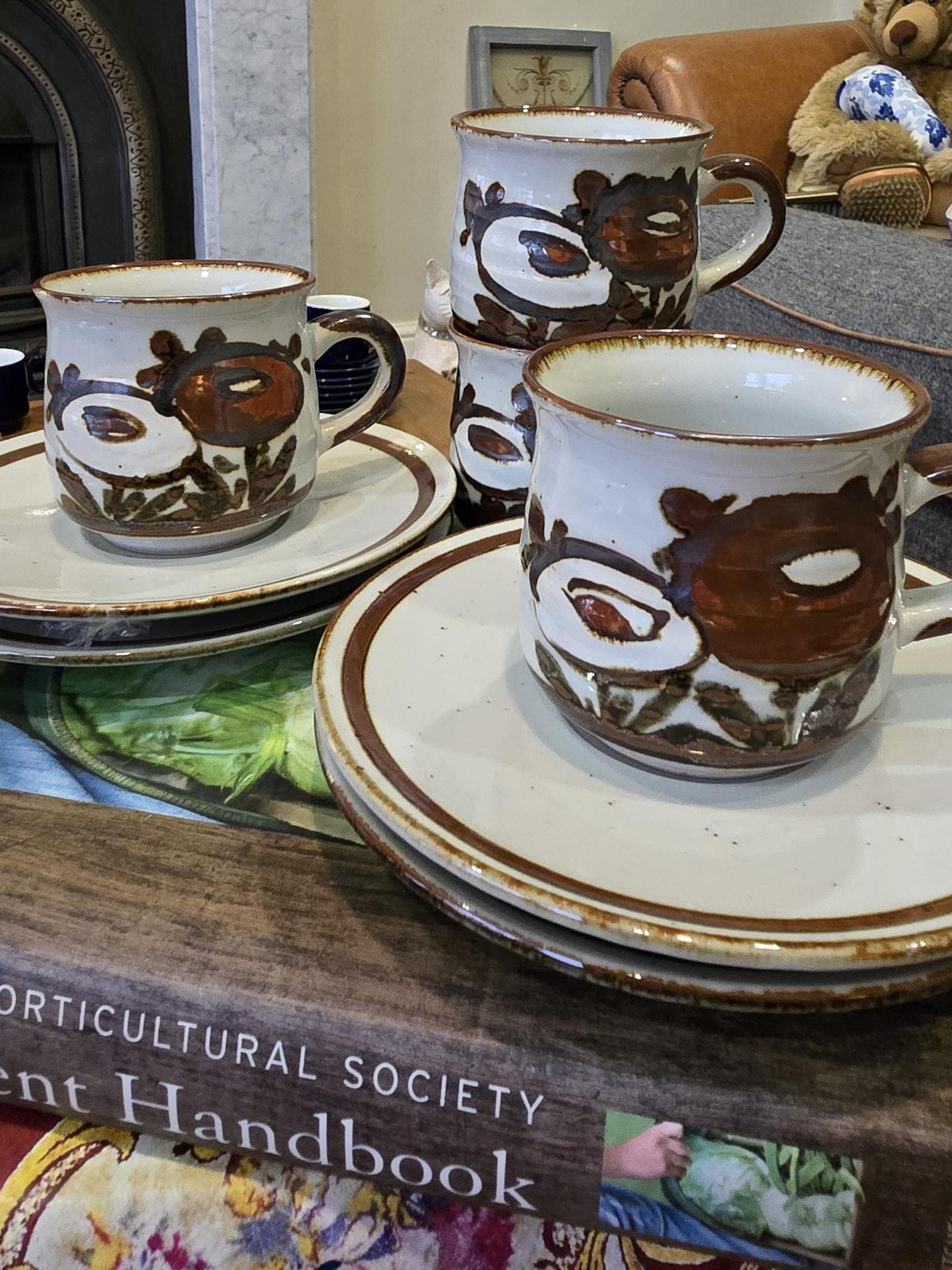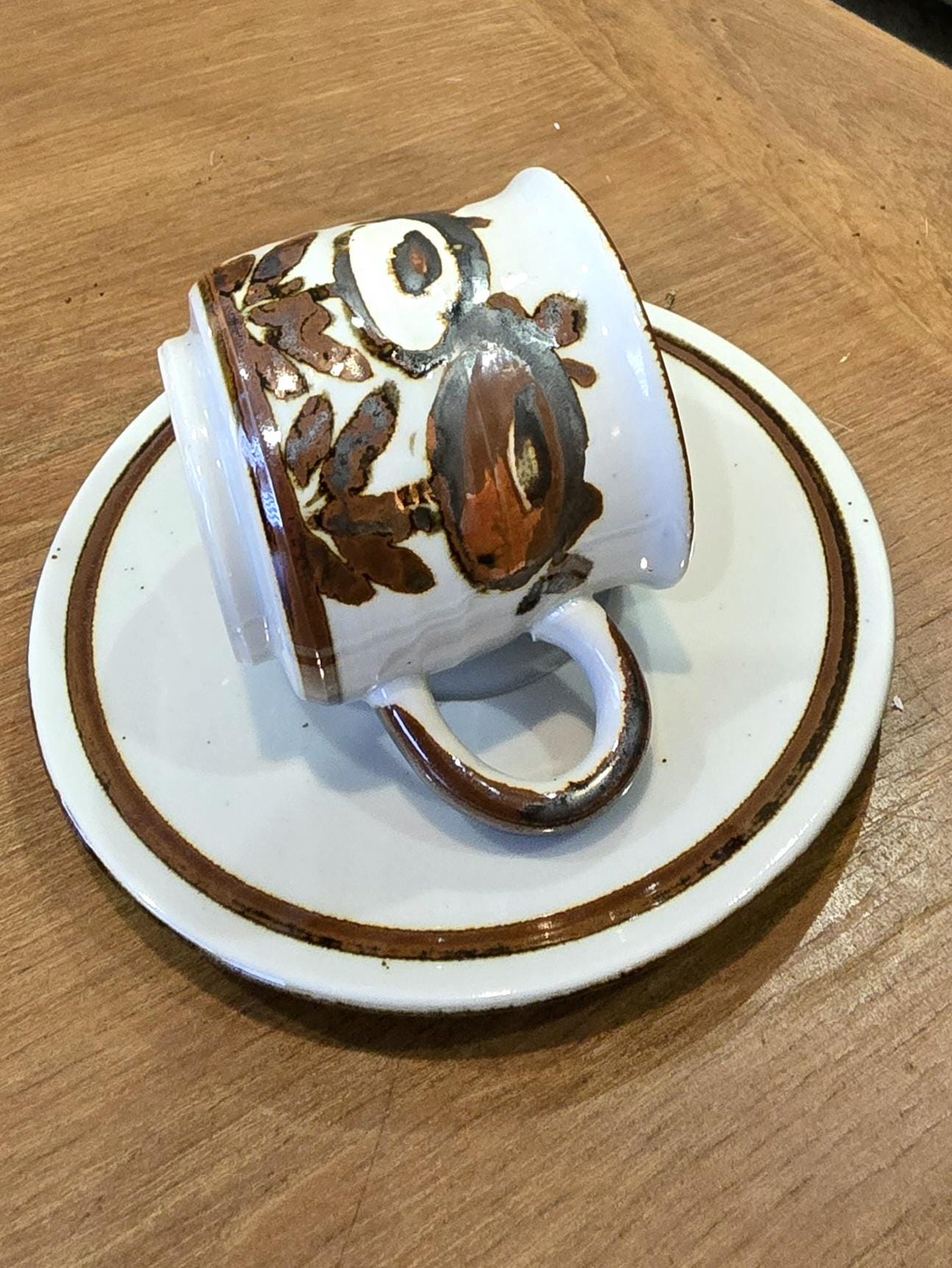 Add a touch of retro charm to your morning coffee with this beautiful set of four vintage Japanese stoneware cups and saucers. Featuring a striking, hand-painted abstract floral motif in earthy browns and creams, these pieces perfectly capture the 1970s Mid-Century aesthetic.