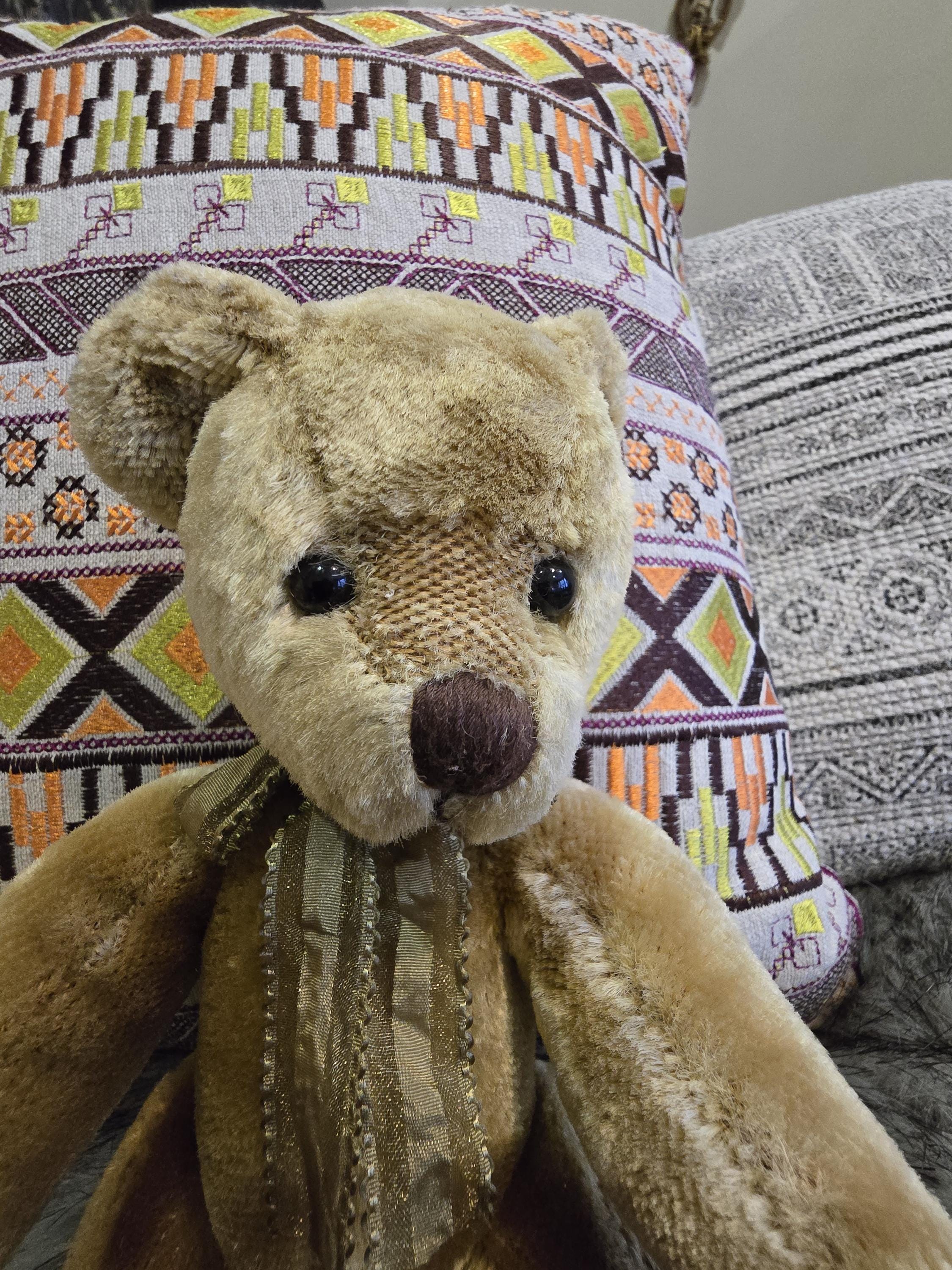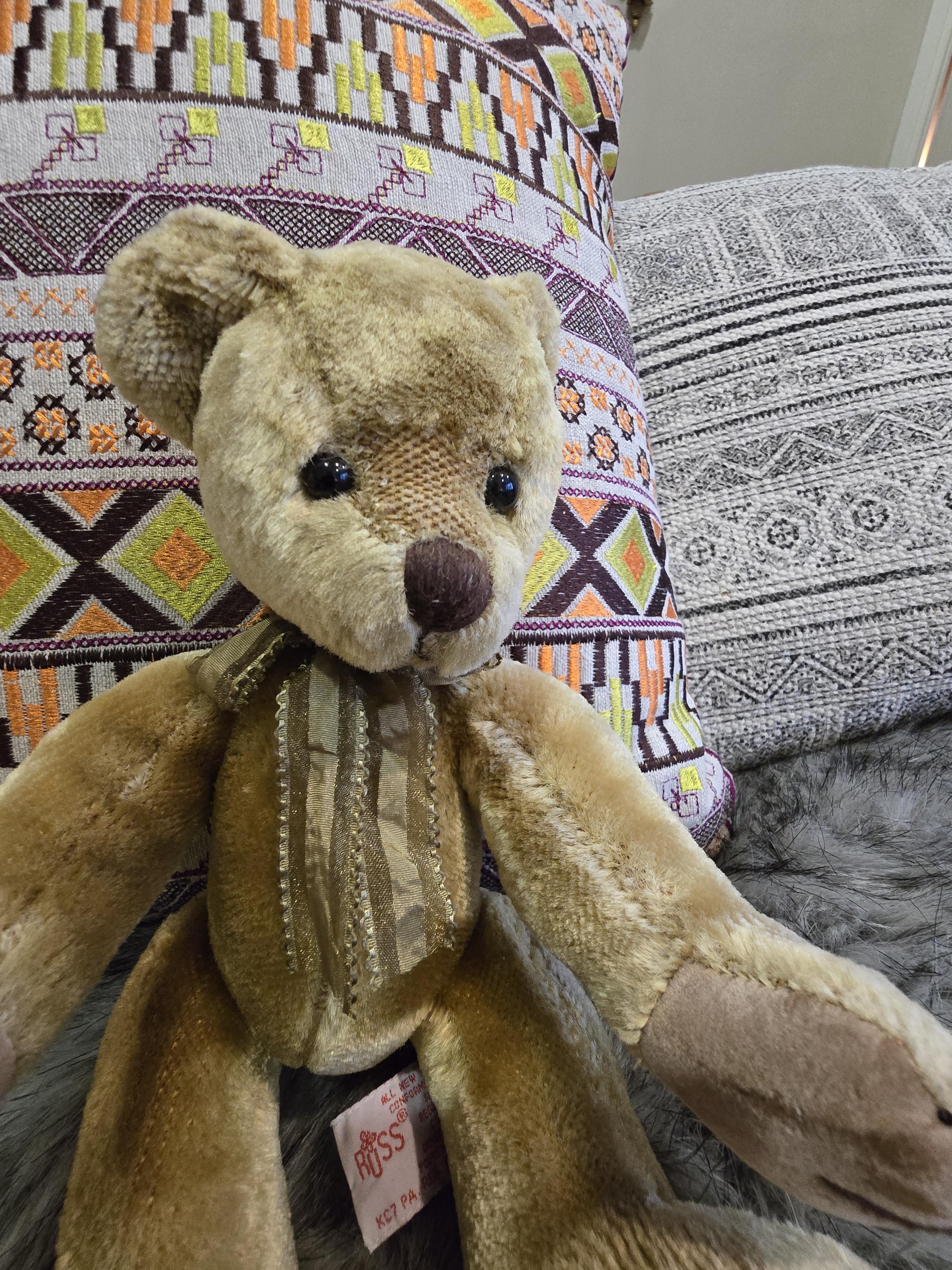 ​We are looking for a loving "forever home" for Dunwell, a stunning mohair teddy bear from the renowned Russ Berrie collection. With his soulful eyes and traditional craftsmanship, he is the perfect addition to any serious bear collection or a thoughtful gift for someone who appreciates vintage charm.