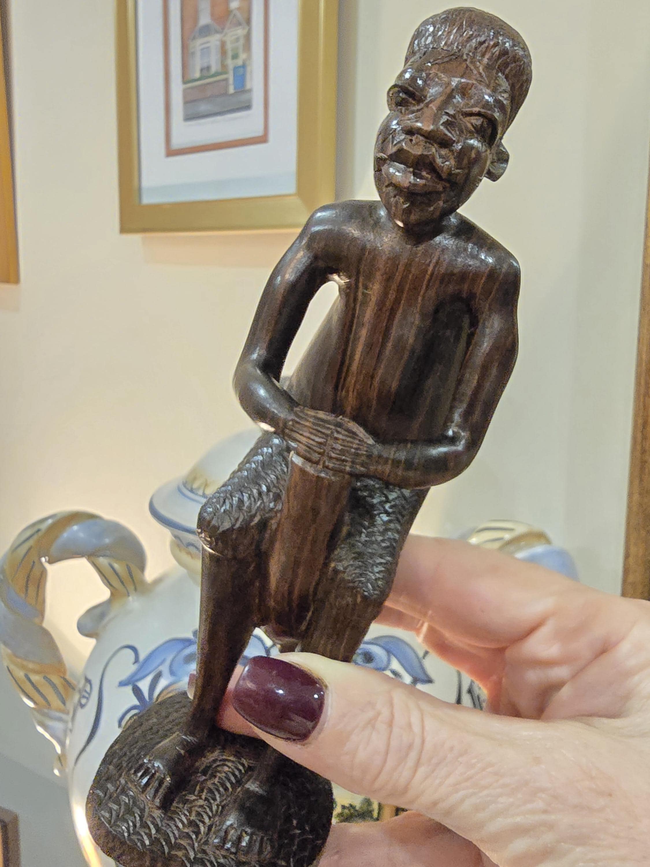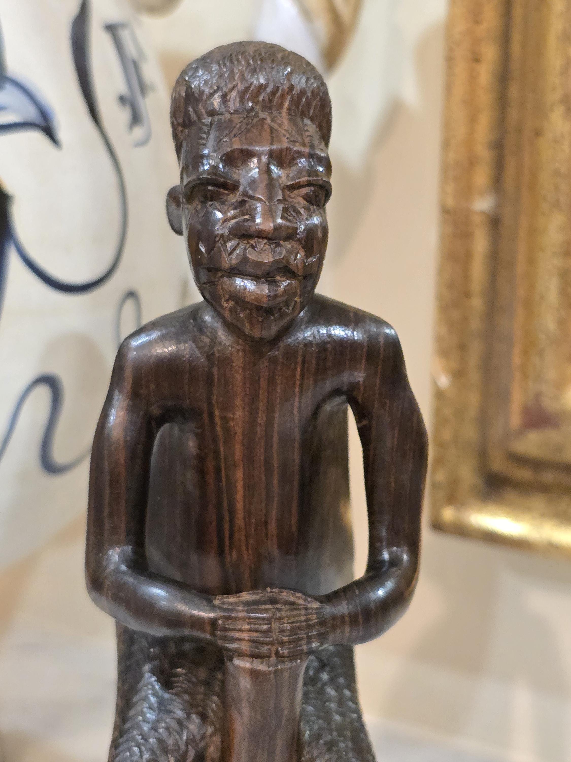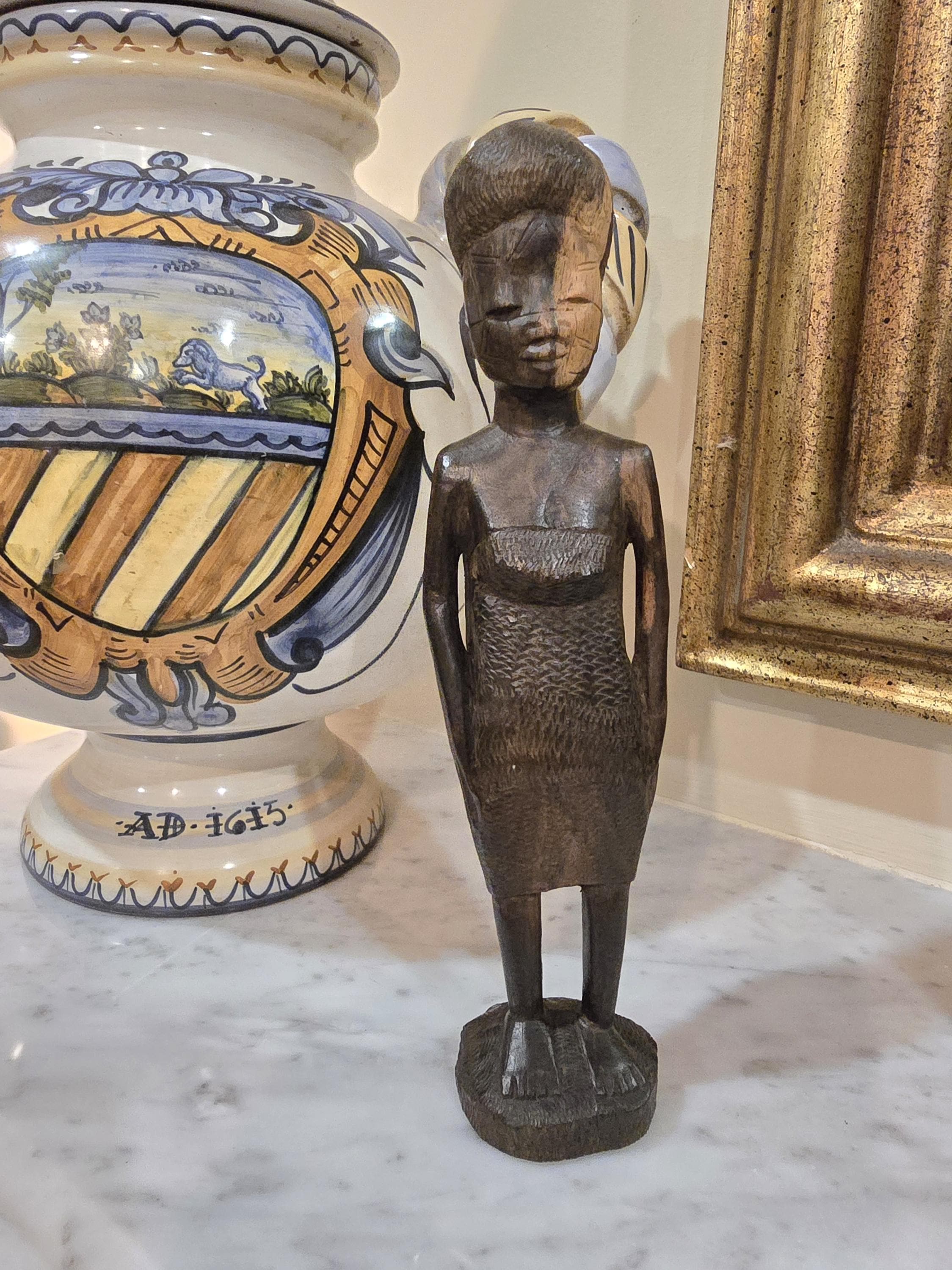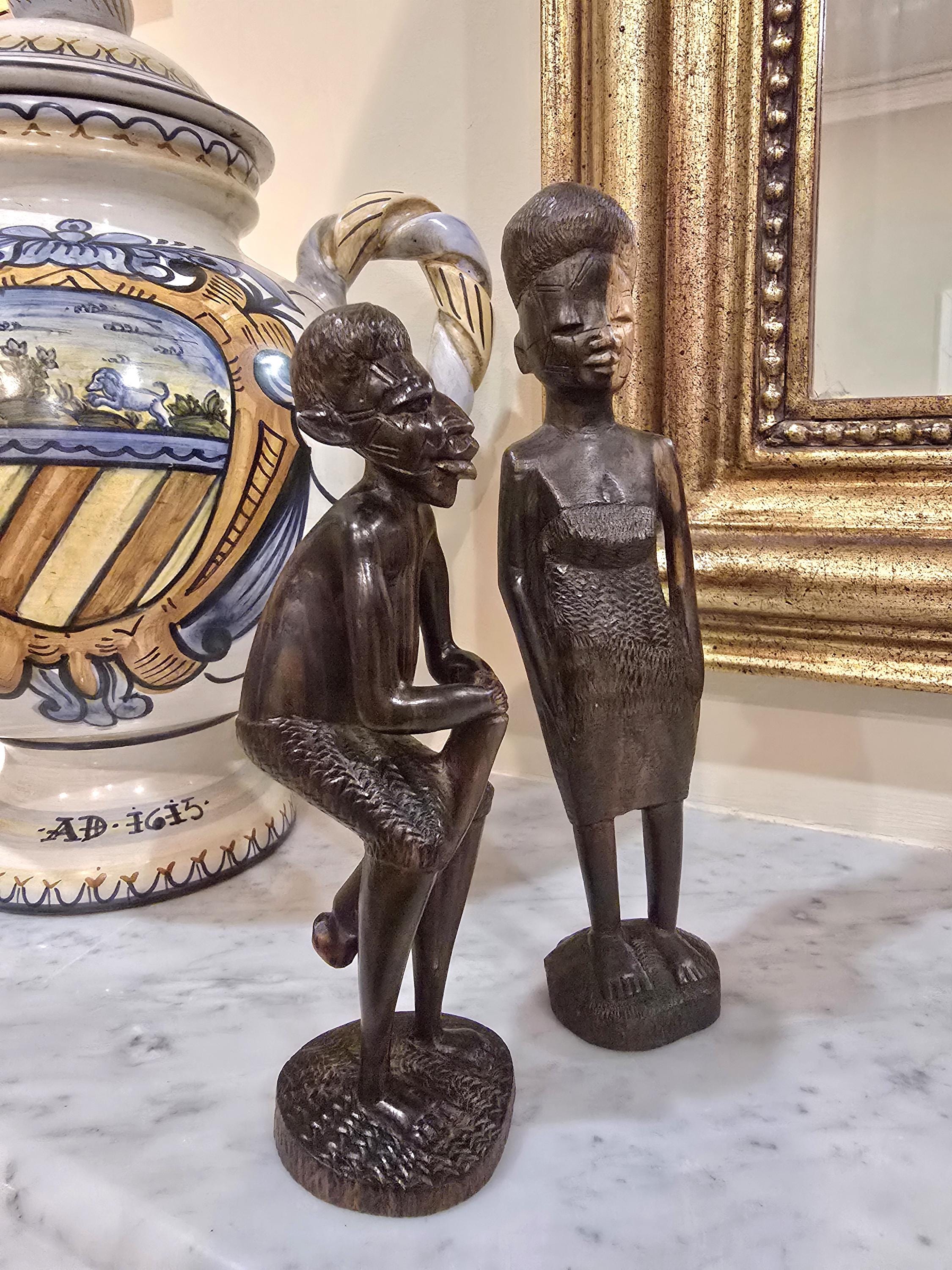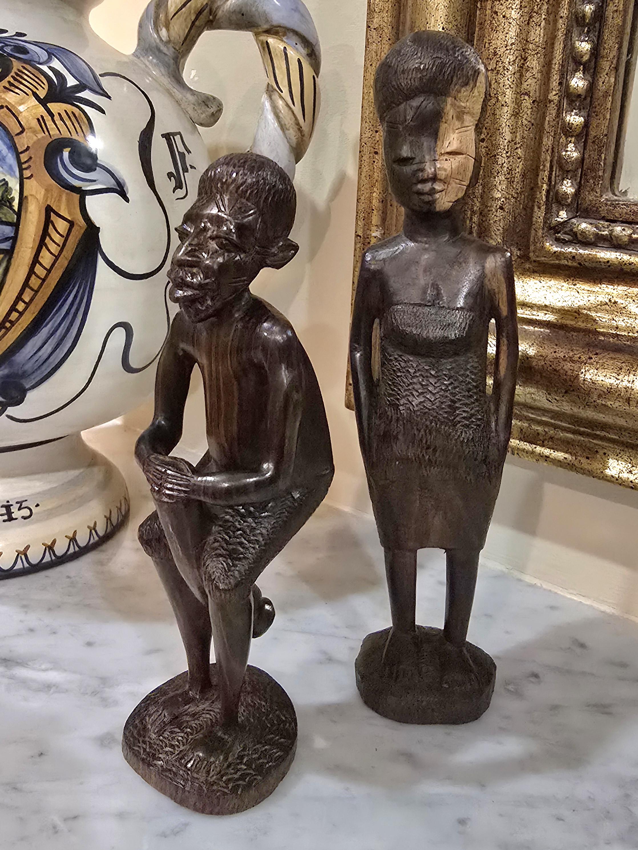 ​This set sourced from The Plum Dish features a man and woman, expertly carved from dense, heavy ebony hardwood. The craftsmanship is wonderful, with intricate "poker-work" textures on the garments and expressive, hand-tooled facial features.