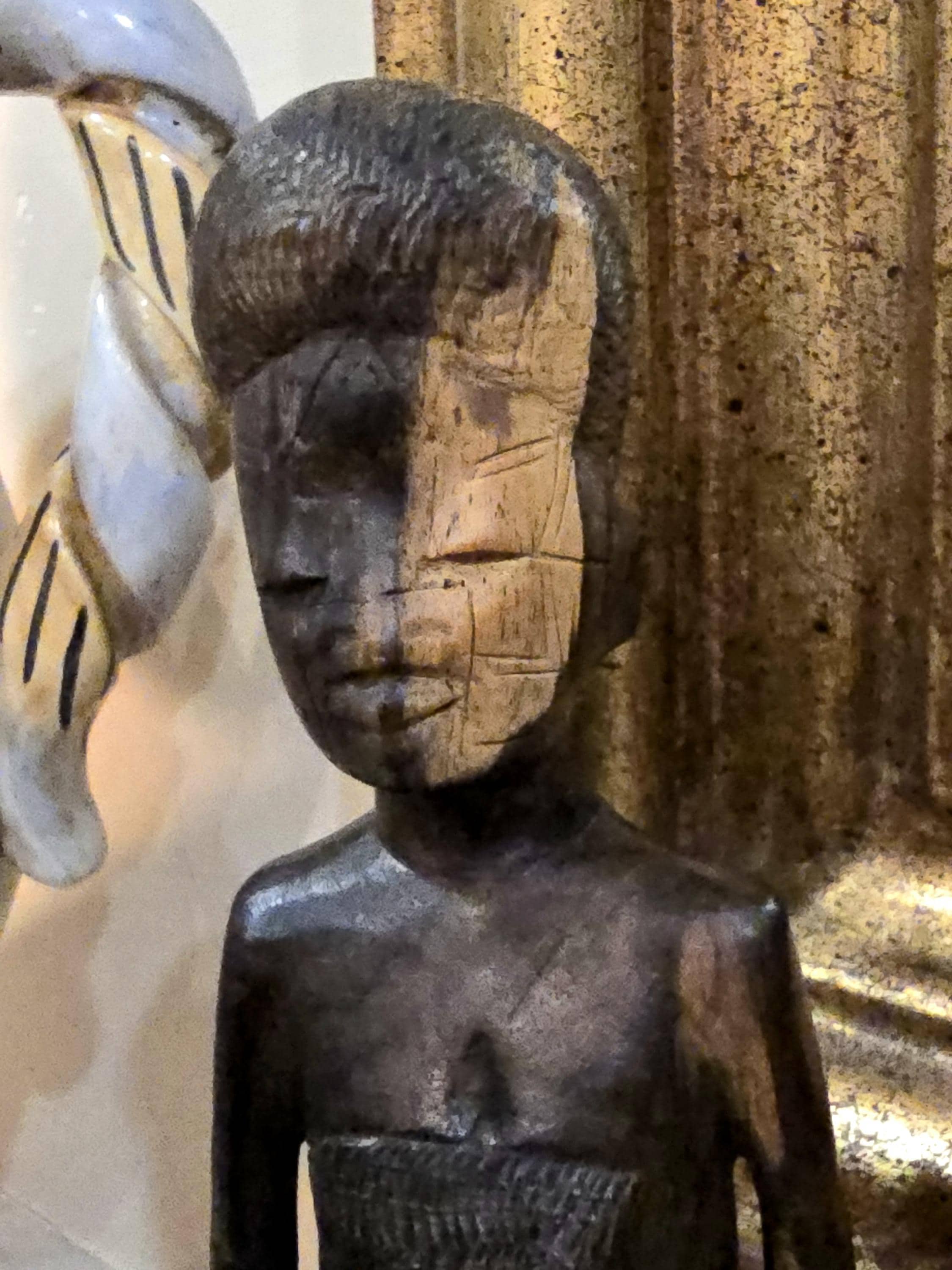 ​The female figure is particularly special, featuring a beautiful natural "sapwood" streak across her face—a testament to the authentic heartwood of the tree.
