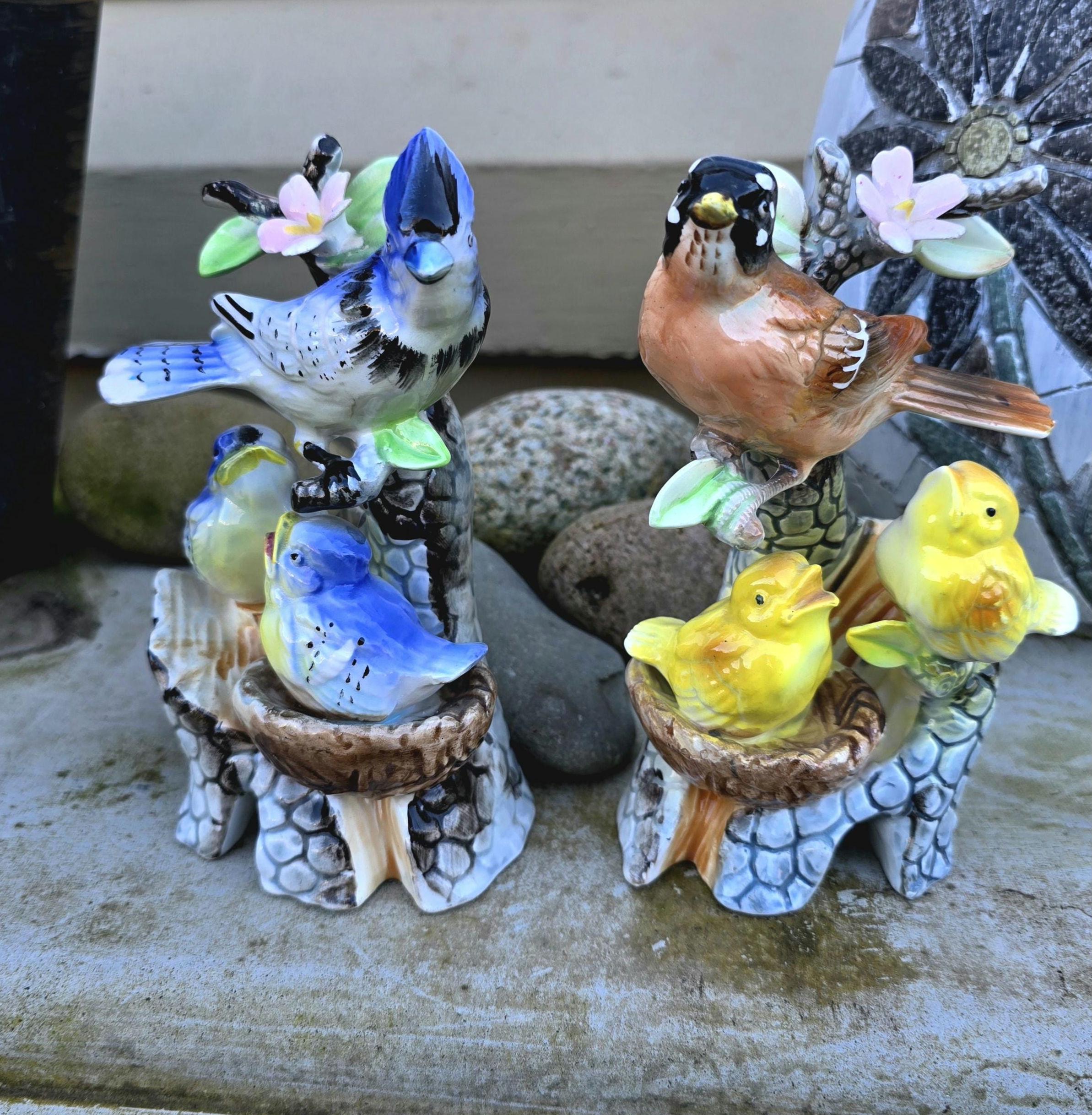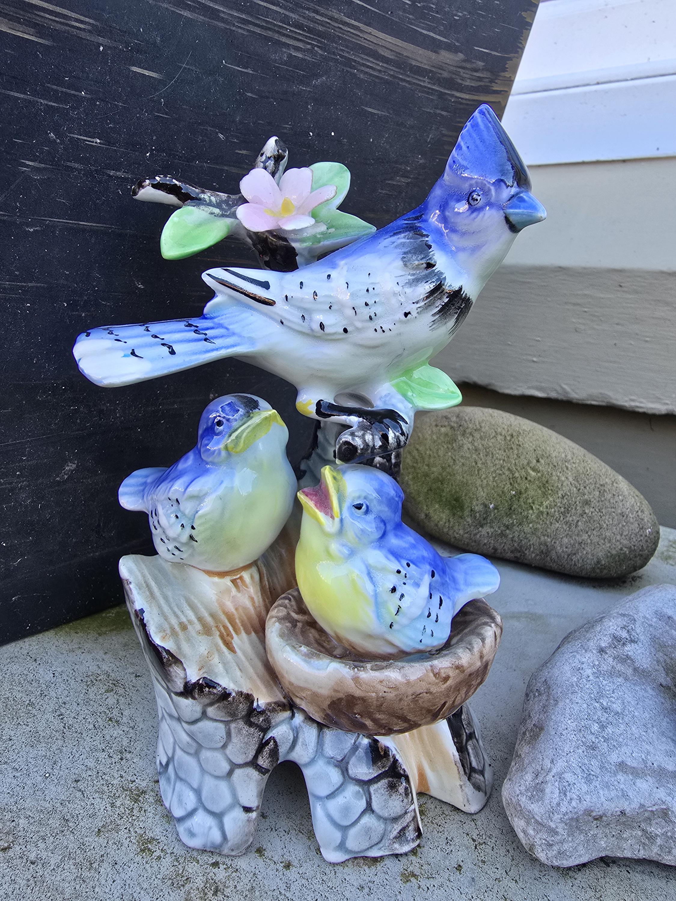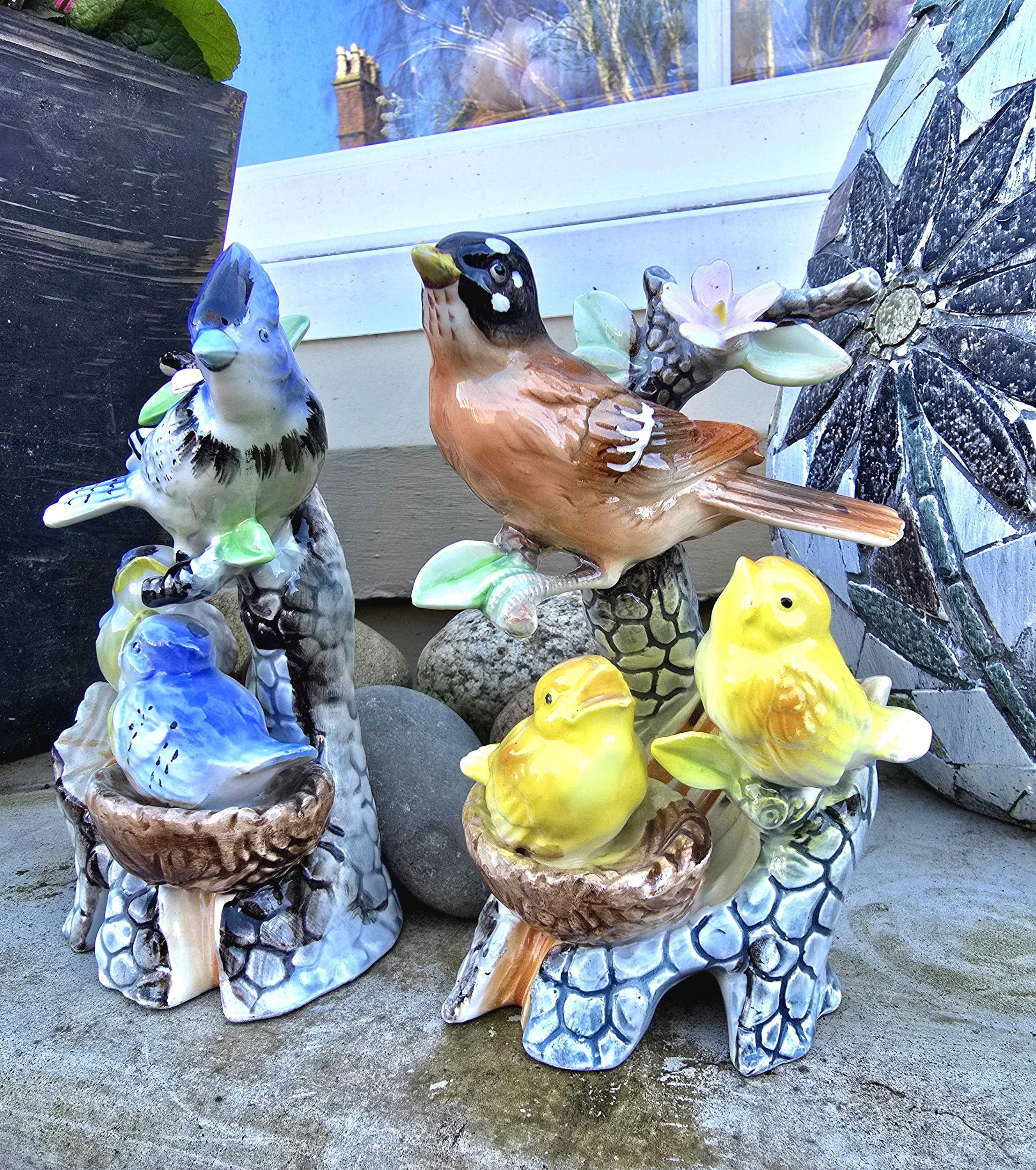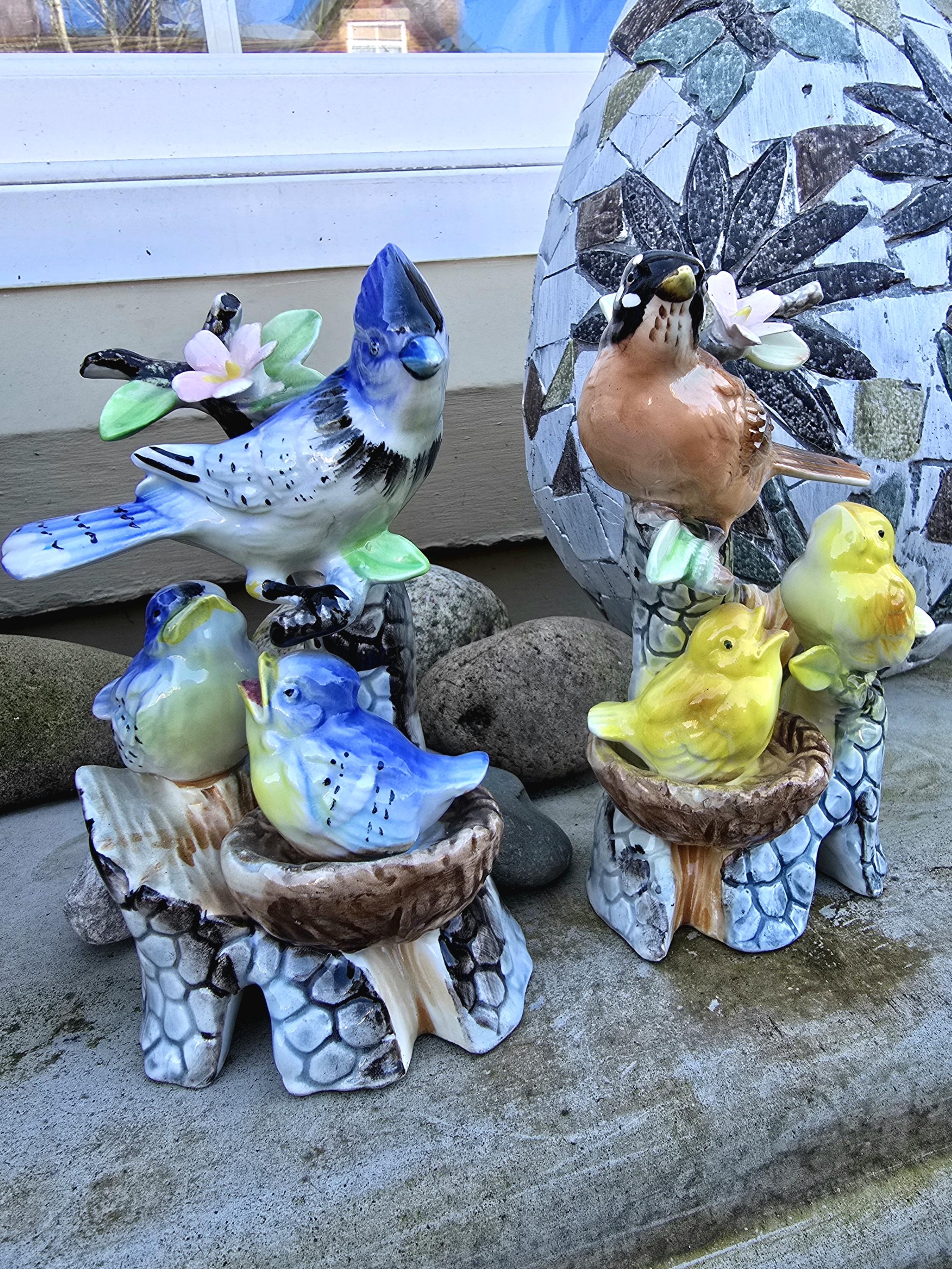 Vintage Porcelain Bird Ornaments - Blue Jay and American Robin with Chicks - 1950s Kitsch
