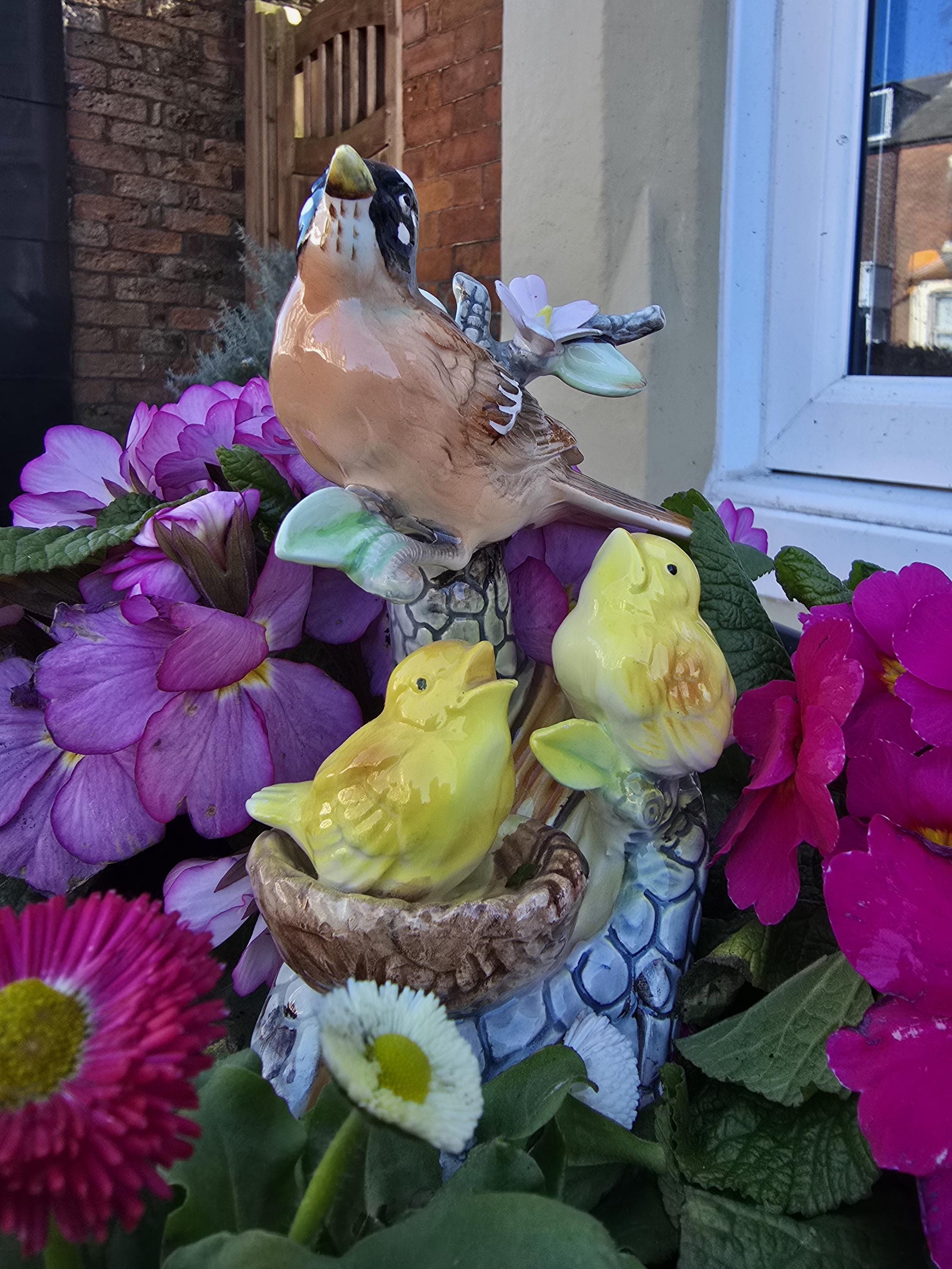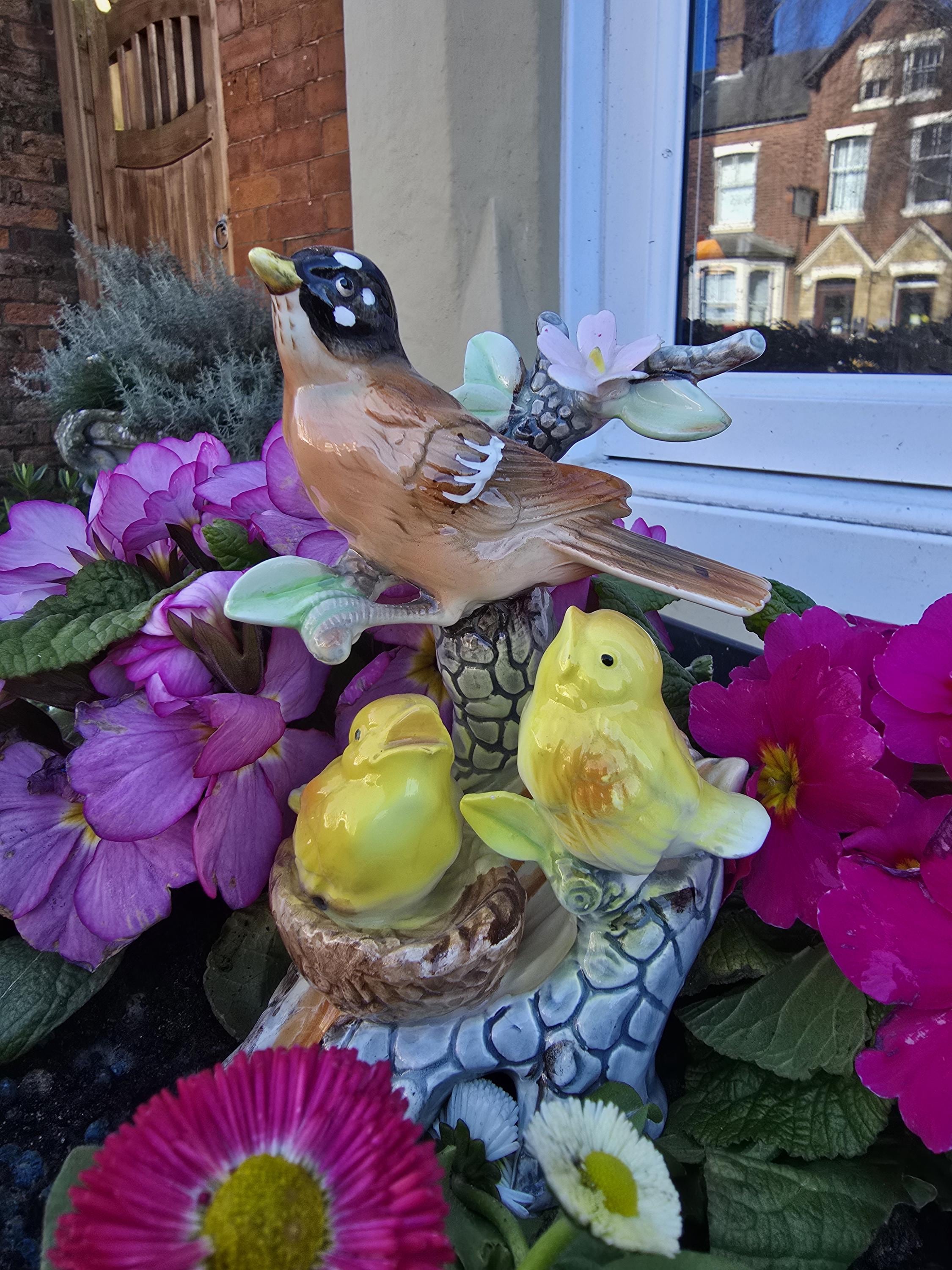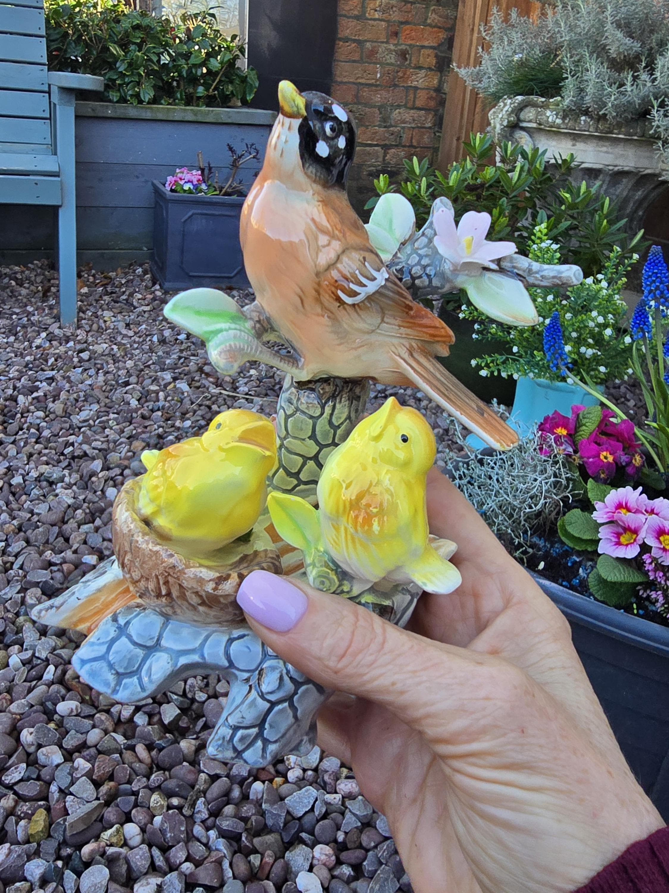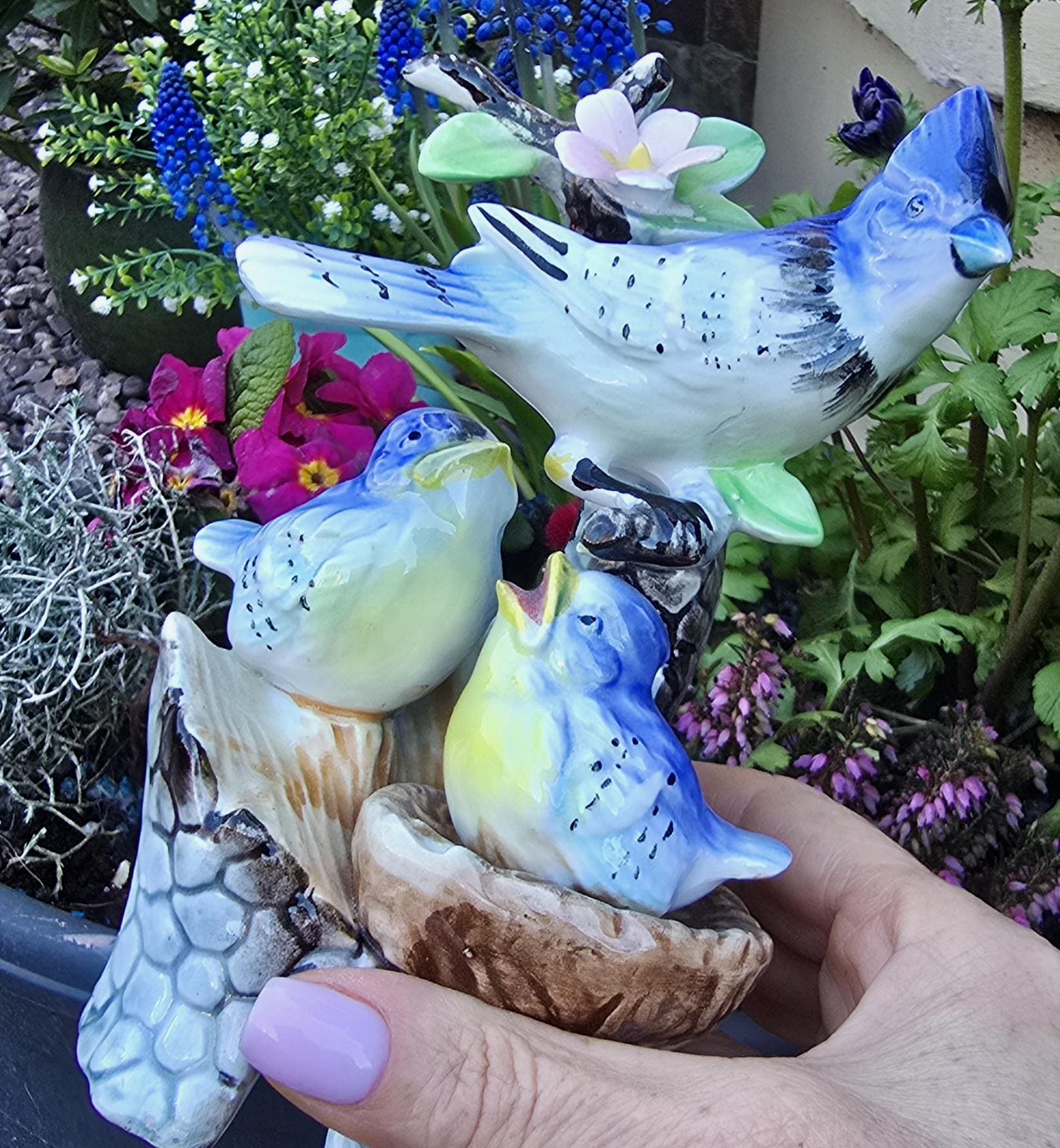 Vintage Porcelain Bird Ornaments - Blue Jay and American Robin with Chicks - 1950s Kitsch